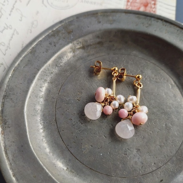 ちょっぴり甘いピンクカラーピアス。 ローズクォーツを中心に淡いピンクカラーのコンクシェル、淡水パールも合わせました。 こころふんわり♪ブーケのようなピアス ピアスを着けて、お花見やピクニックに出かけませんか? ※一点ものになります。 ※ネジバネ式イヤリング金具へ変更可能です。 【おもな材料】 ・ローズクォーツ ・コンクシェル ・淡水パール ・スティックパーツ/18KGP ・サージカルステンレスポストピアス 【サイズ】 ・全長約3.5cm(ピアス金具含む) Instagram → https://www.instagram.com/usair0/ usairo