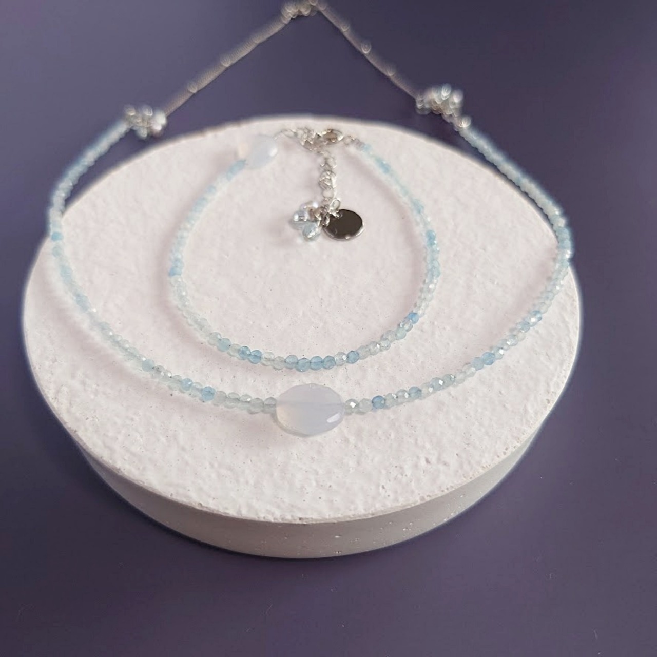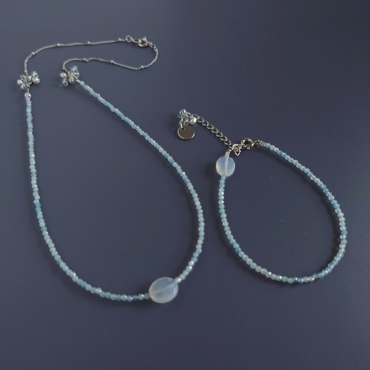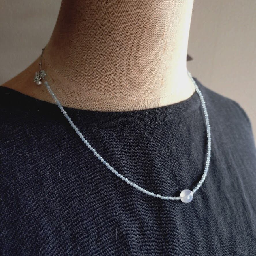 約2mmのアクアマリンにアクセントとしてミルキーなカラーのブルーカルセドニーをあしらいました。