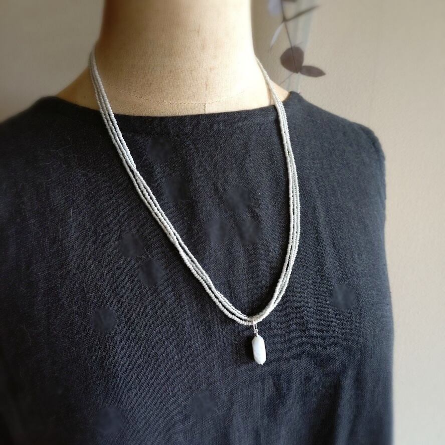 クリアグレーとシルキーなパールソフトグレーの2種類のシードビーズでお仕立てした3連ネックレス。