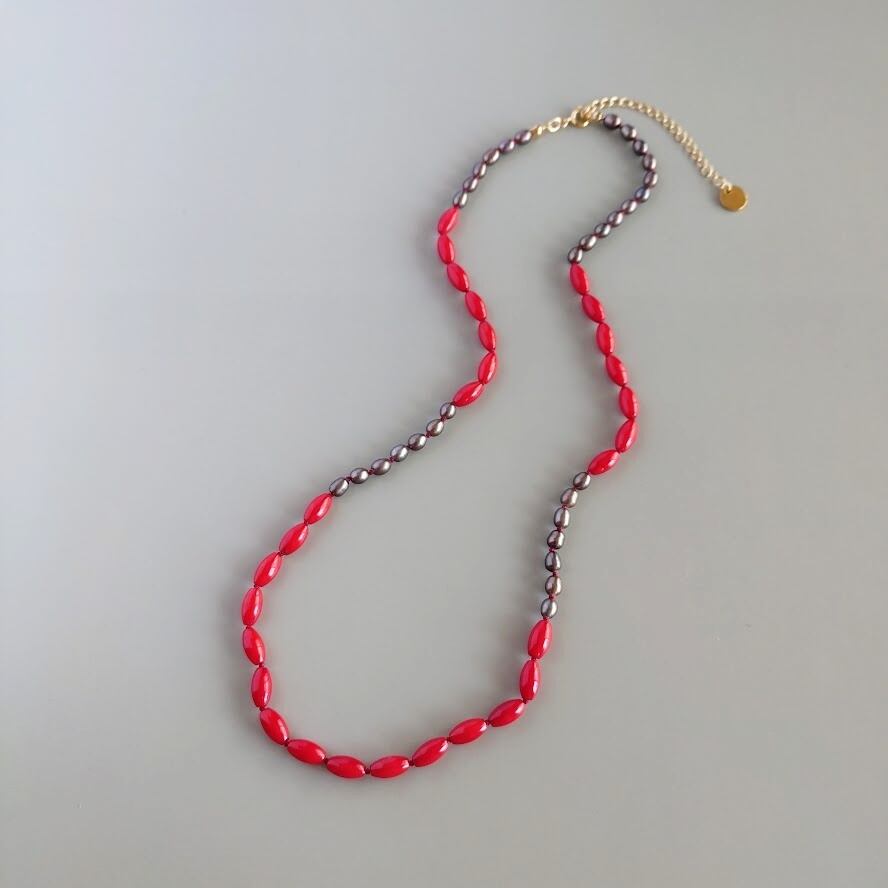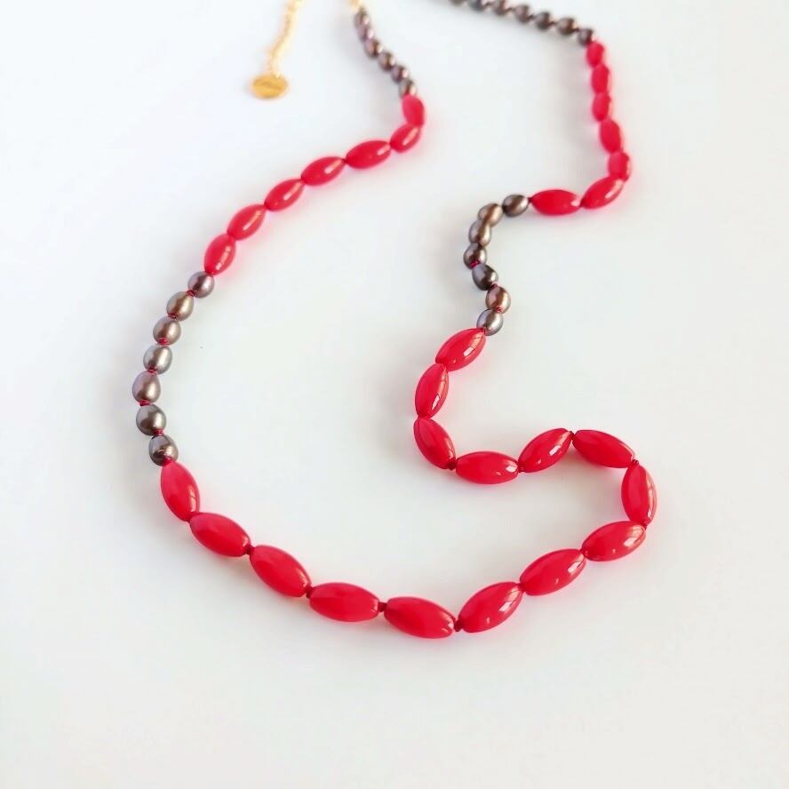 レッドコーラルを使用したシルクコードネックレスの新作です。
