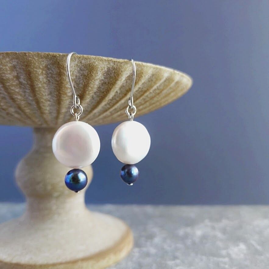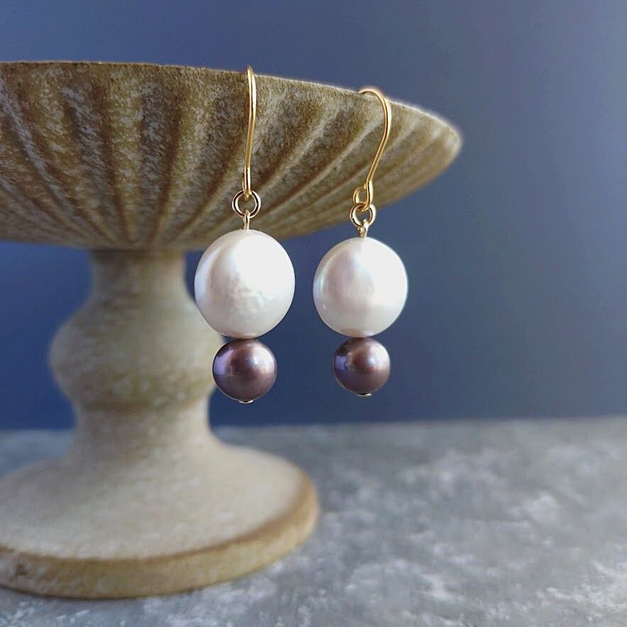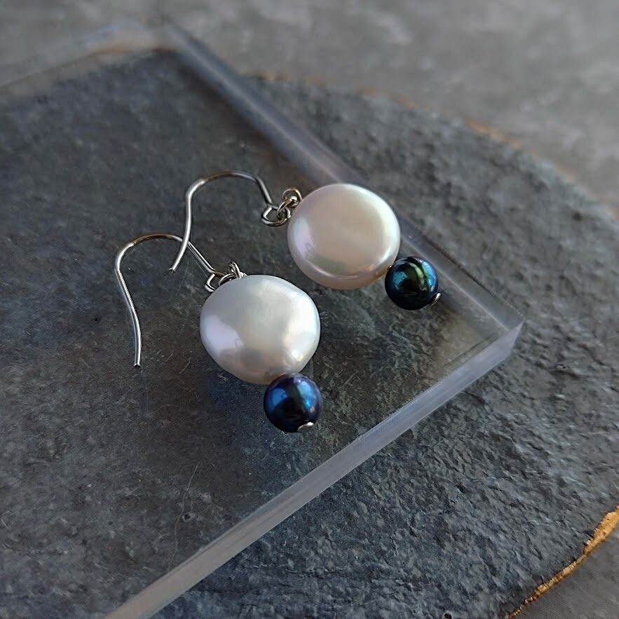 上質なコイン型の淡水パールを使ったバイカラー仕立てのピアスです。