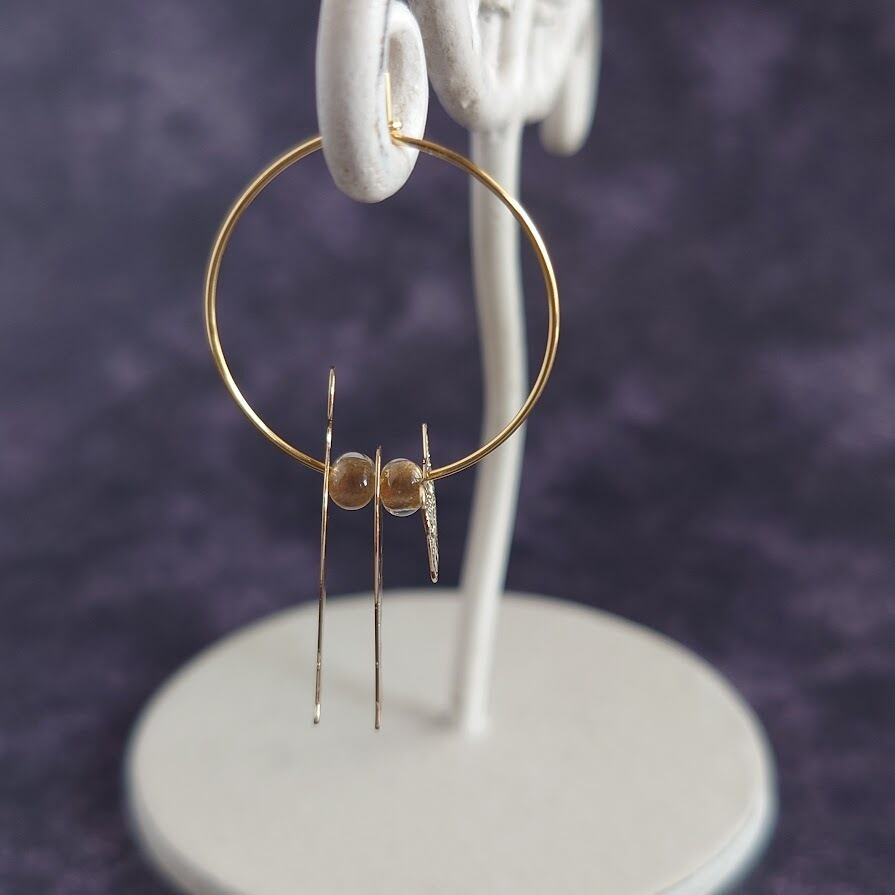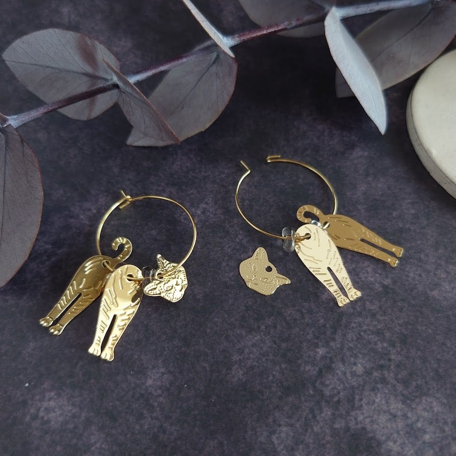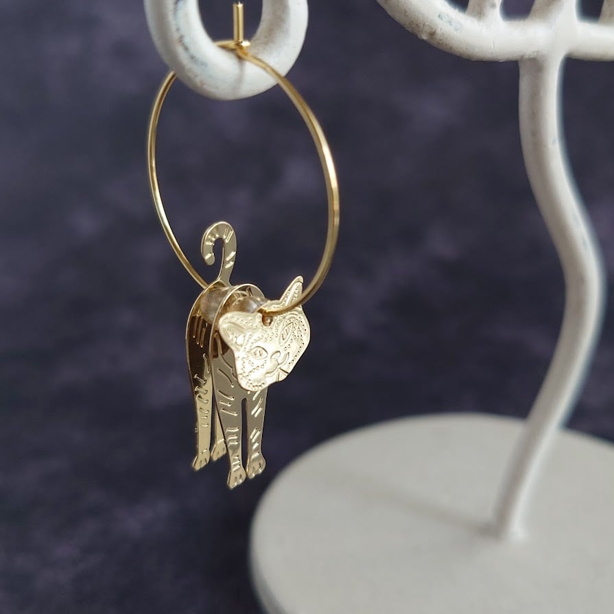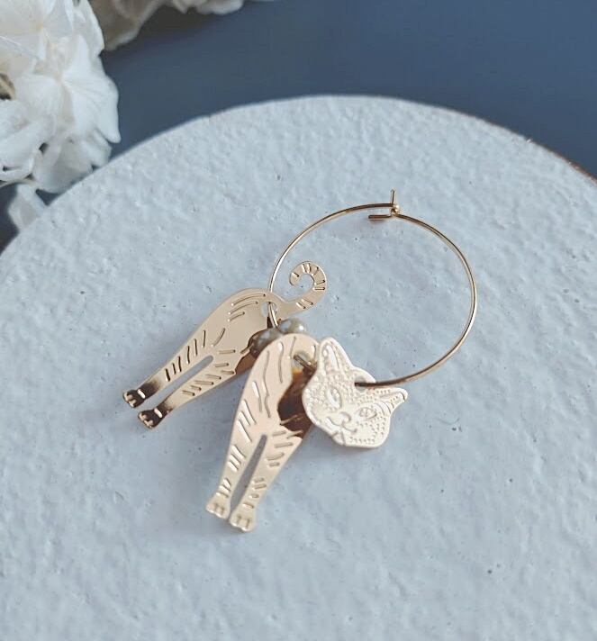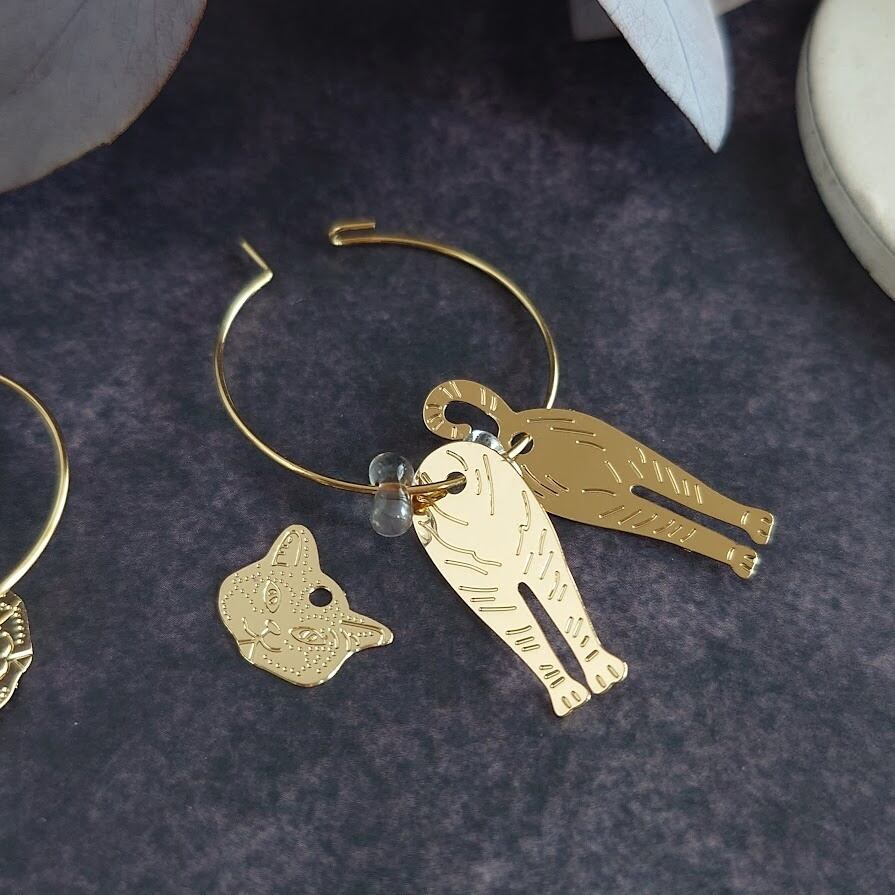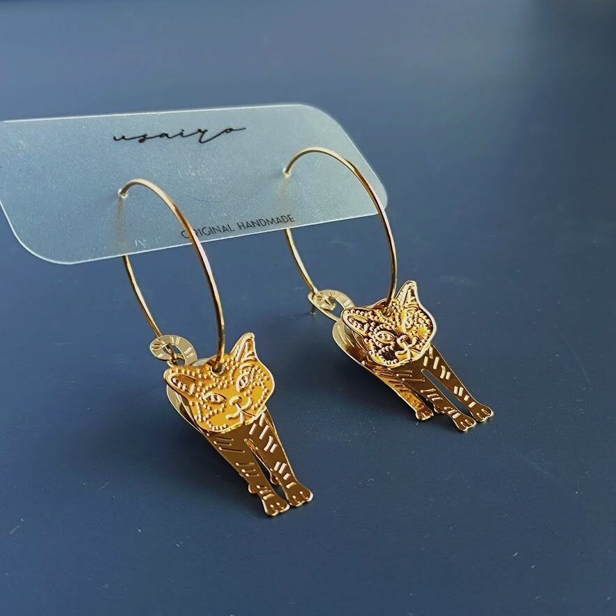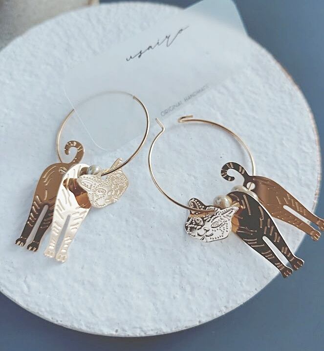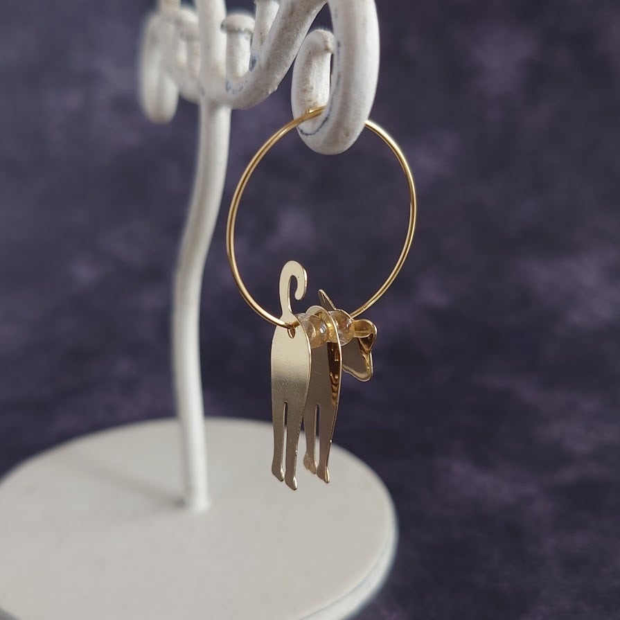 シンプルなフープピアスに猫ちゃんのパーツが重なり合う楽しい耳飾り。