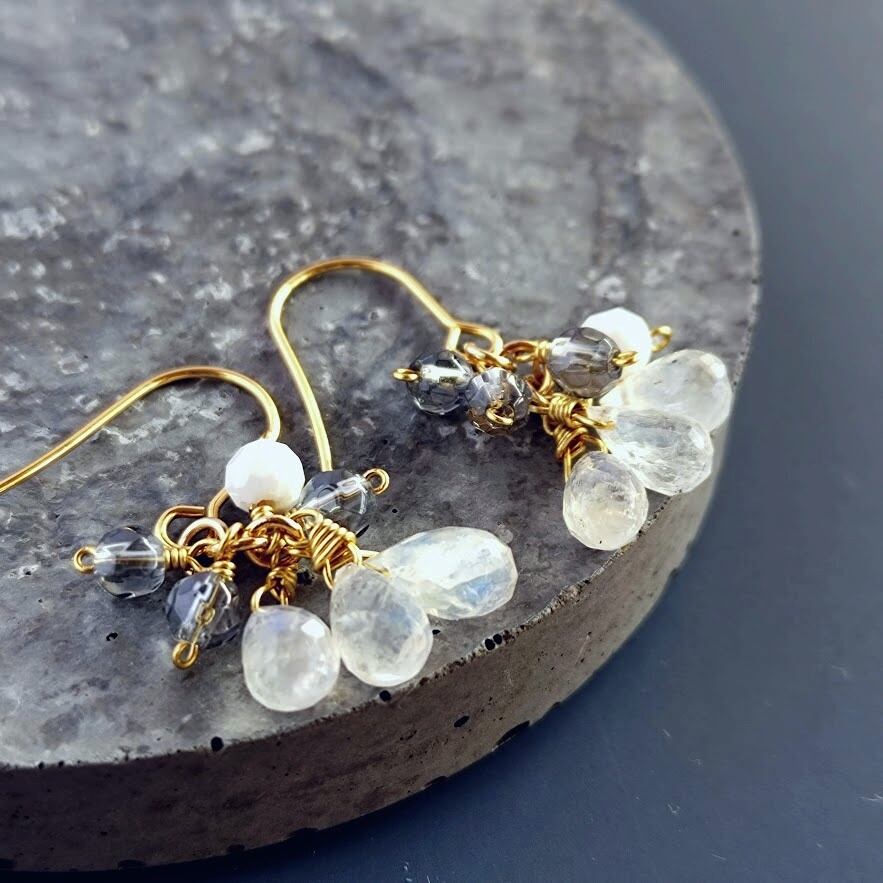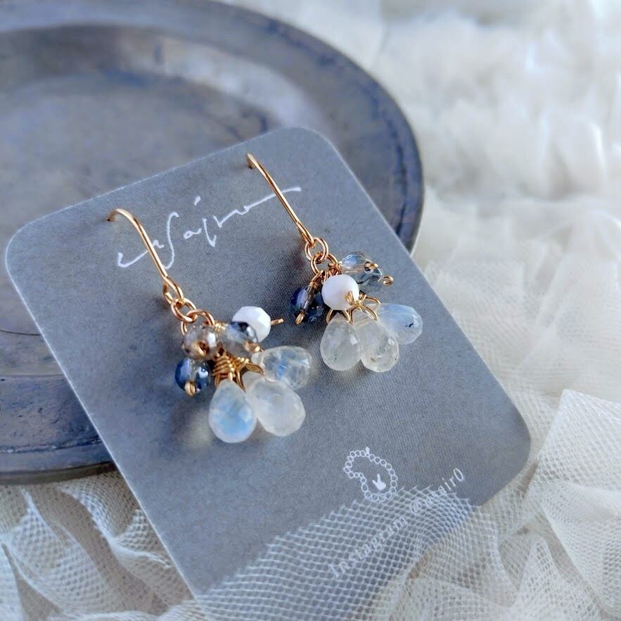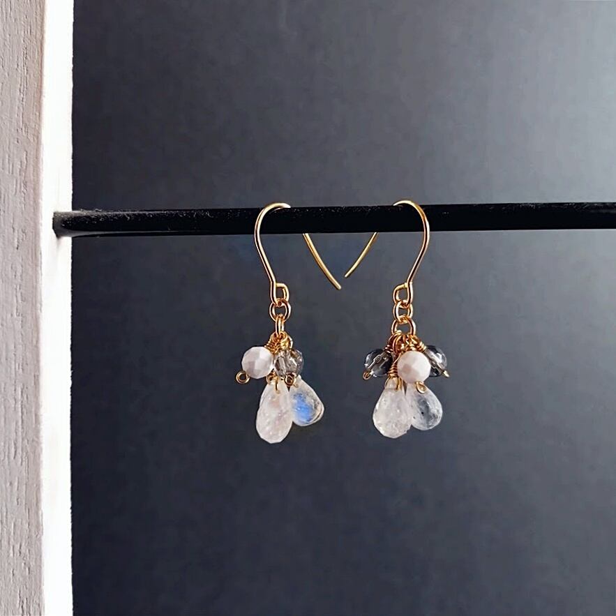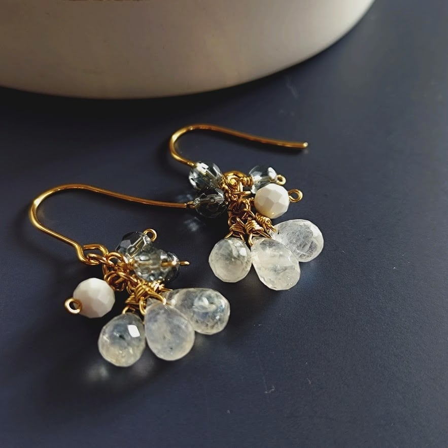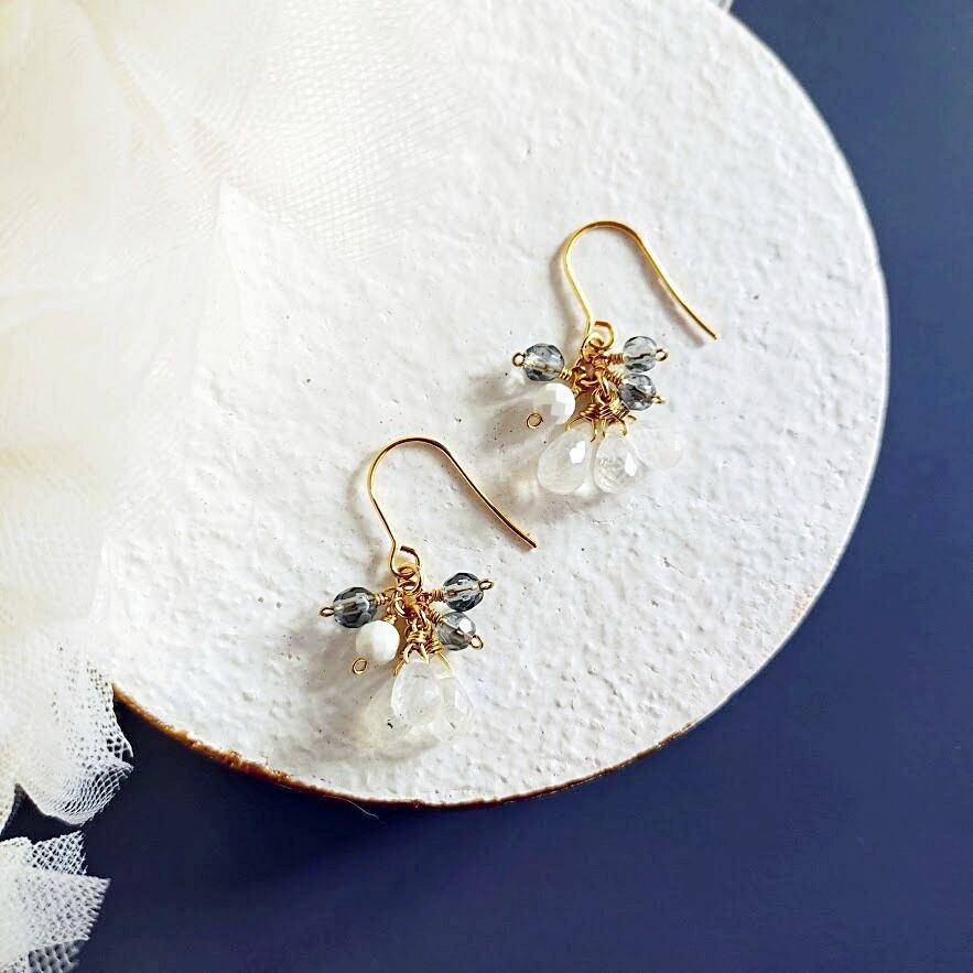 ホワイトラブラドライトのしずくピアス/ホワイト&グレー