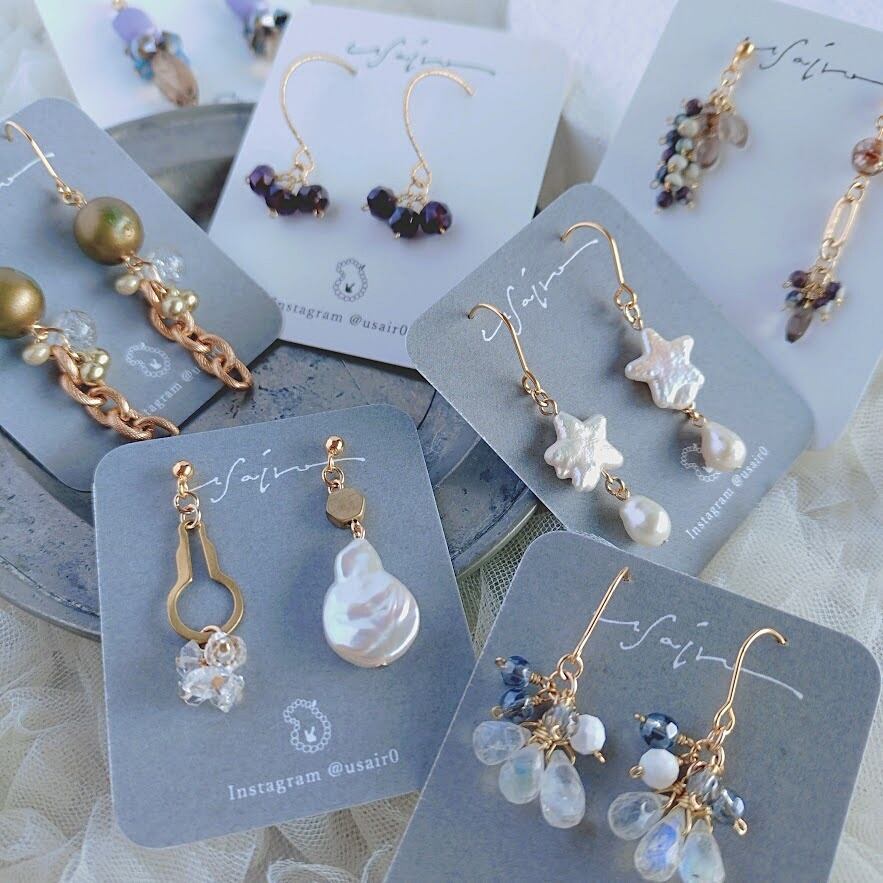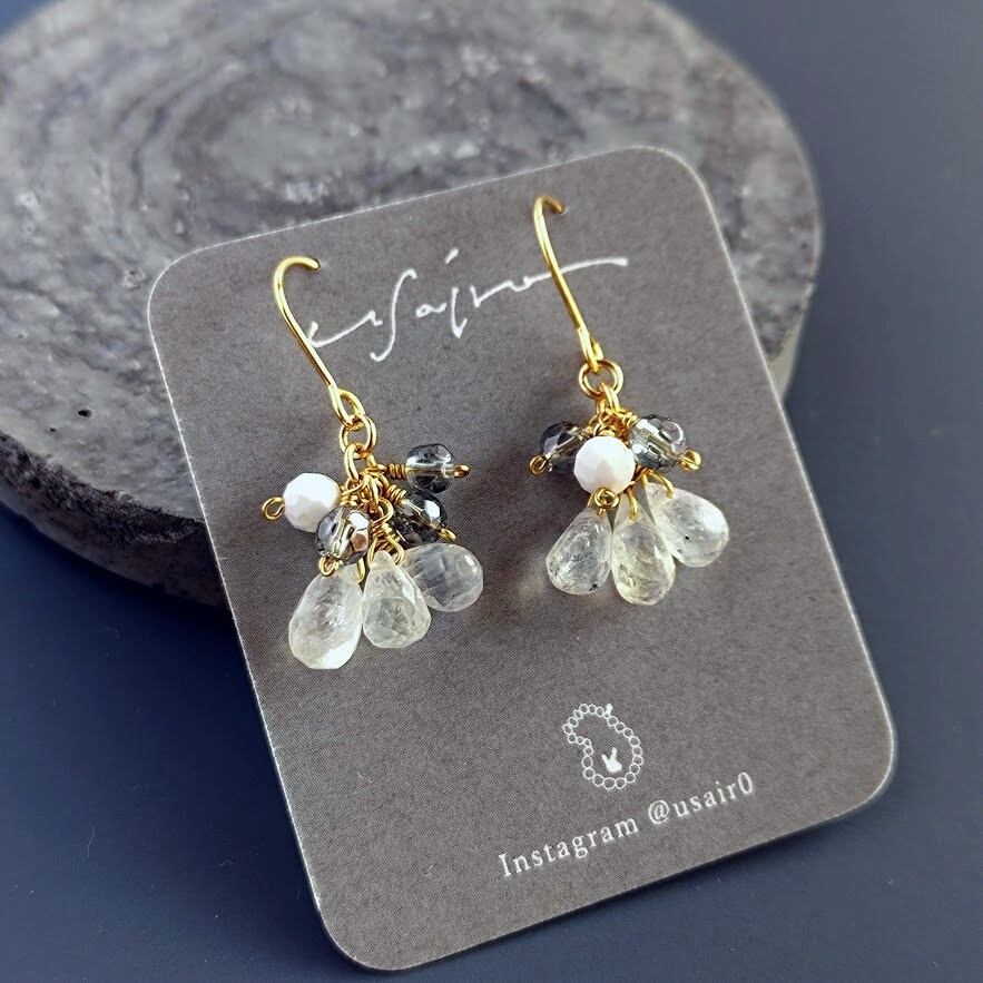 ホワイトラブラドライトを主役にシックで落ち着いたmixピアスをお作りしました。