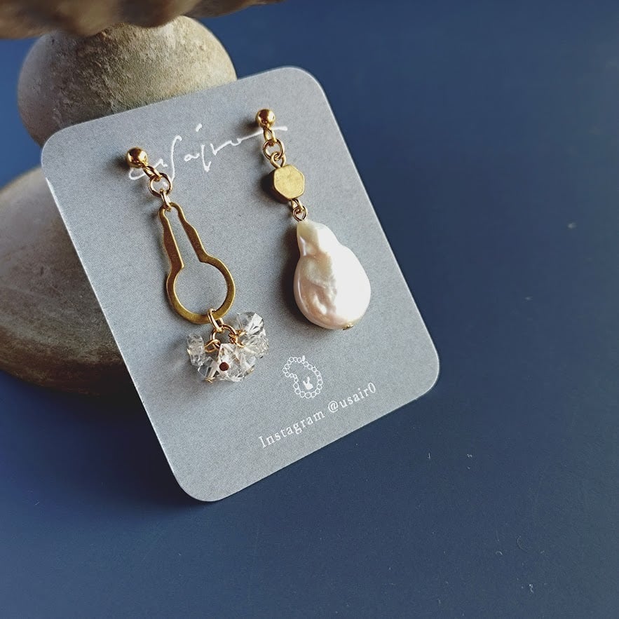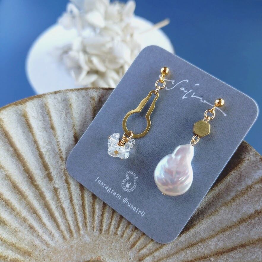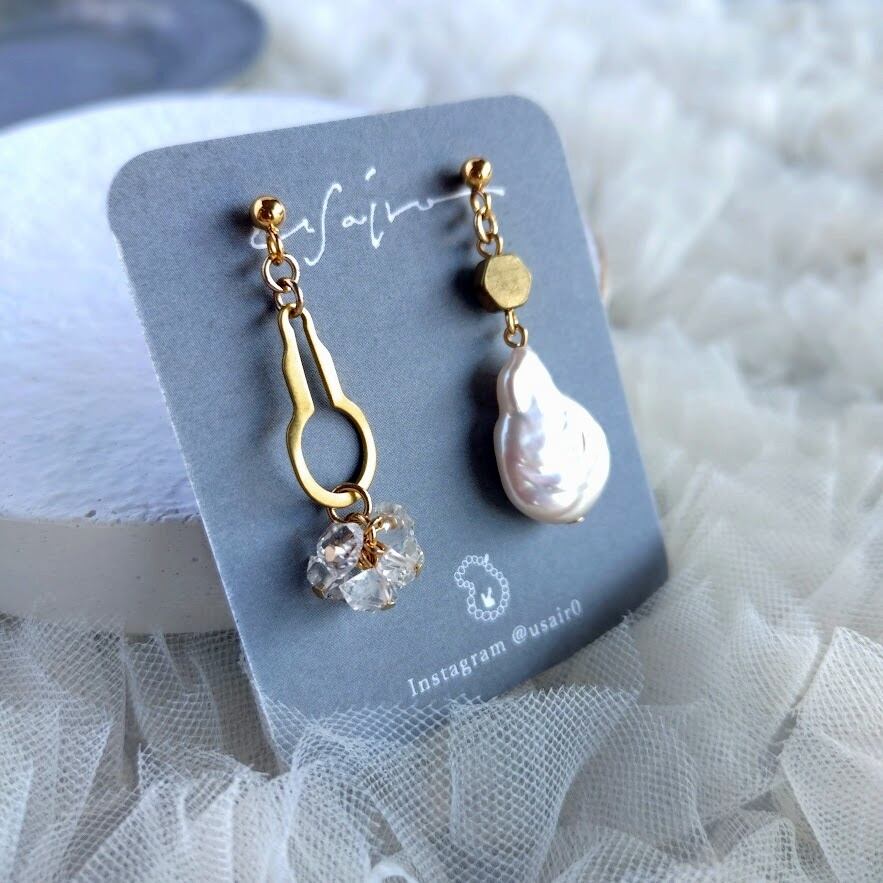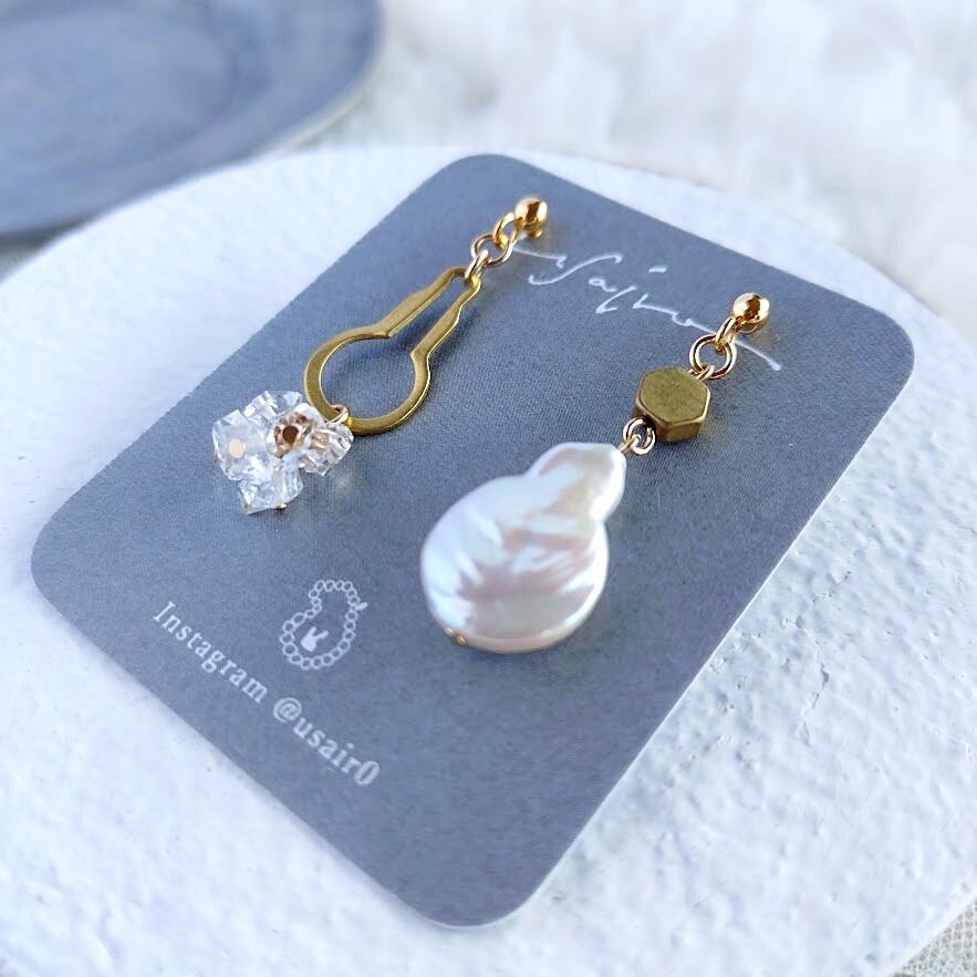 キラキラWポイントクォーツ×個性派パールのアシメピアス