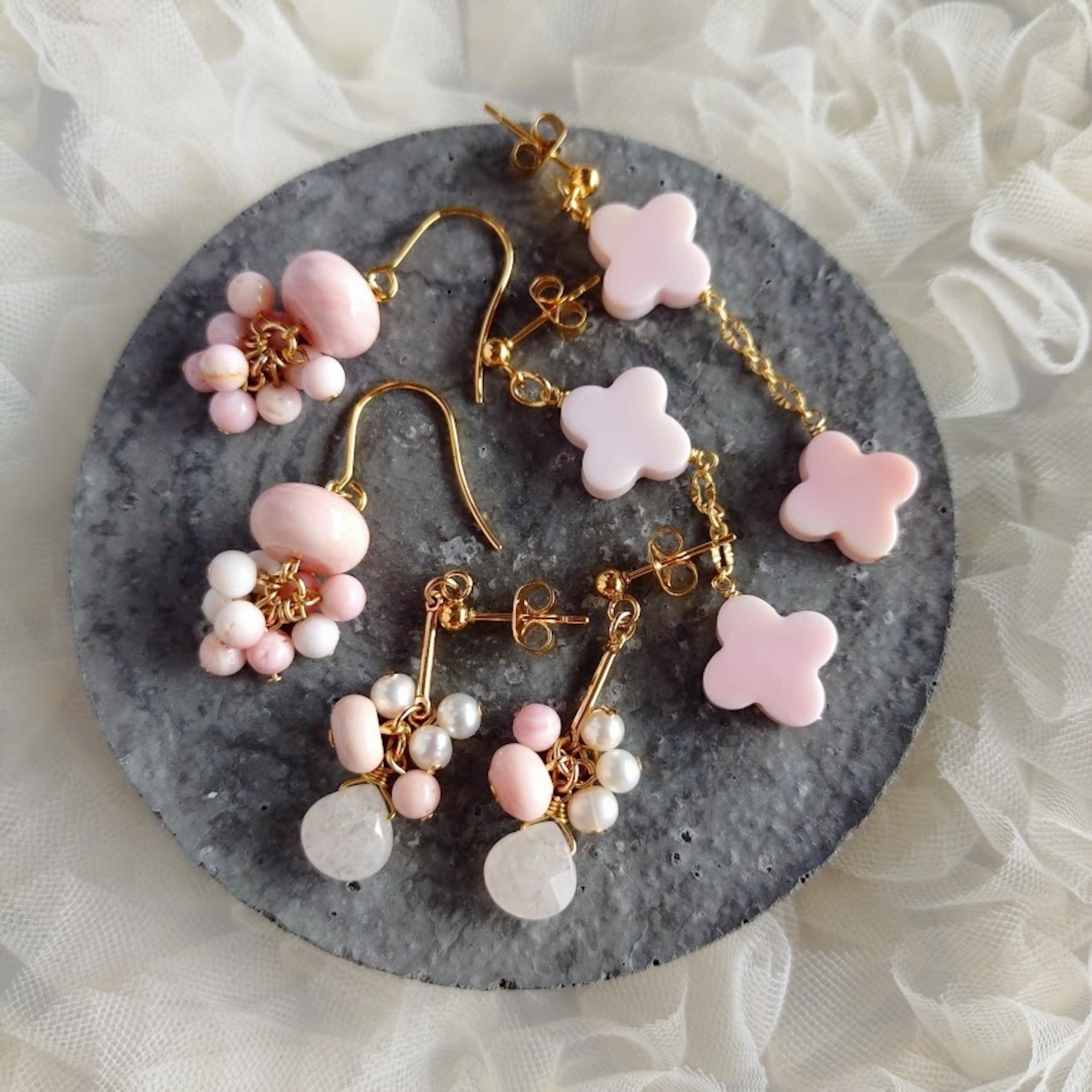 ローズクォーツを中心に淡いピンクカラーのコンクシェル、淡水パールも合わせました。