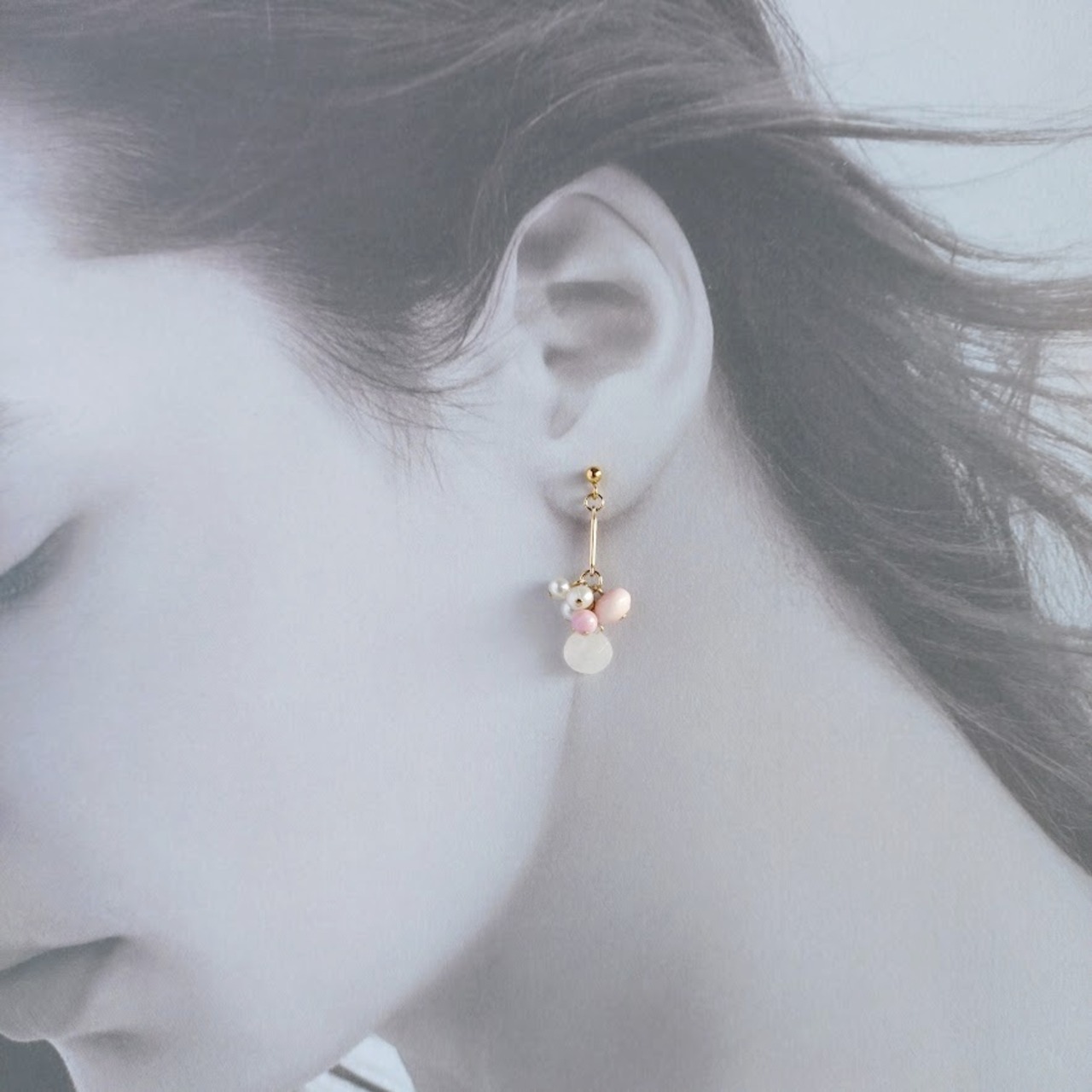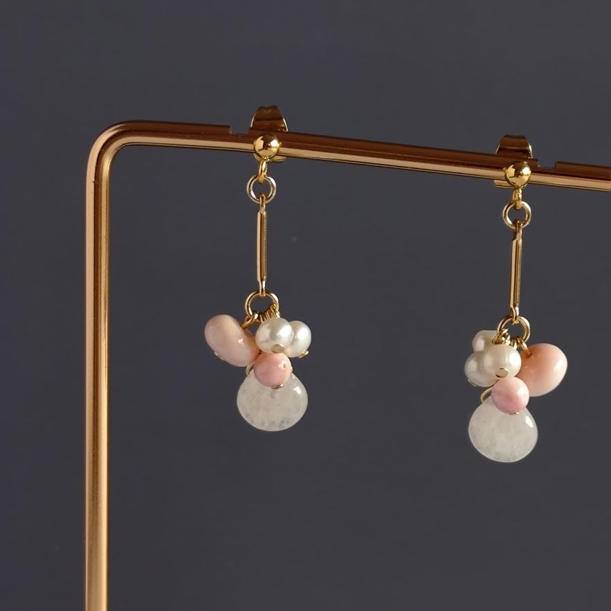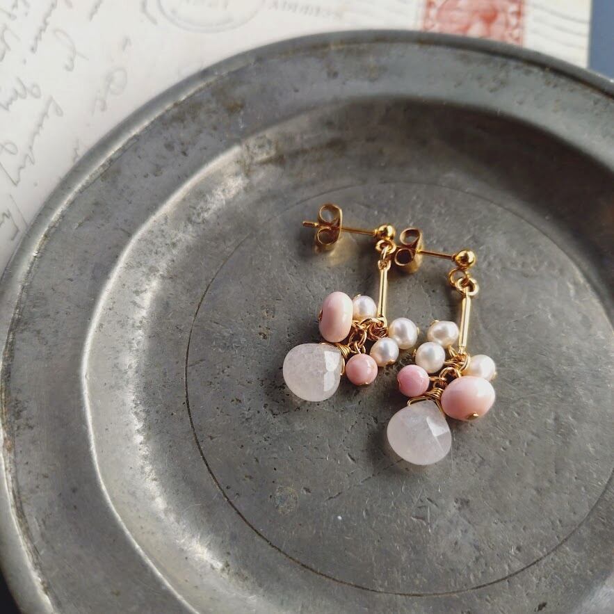ふんわりピンクカラーピアス/ローズクォーツ コンクシェル パール