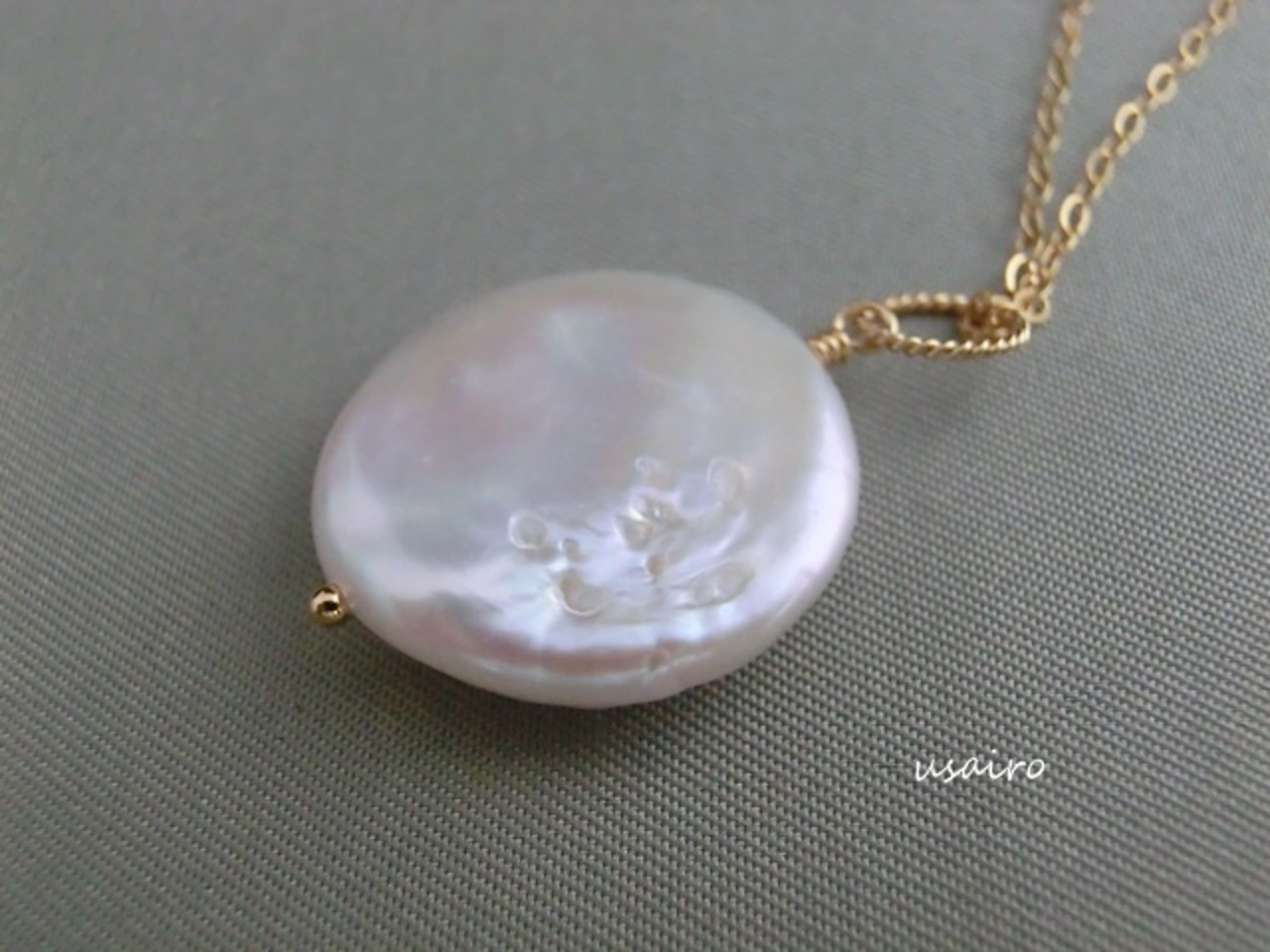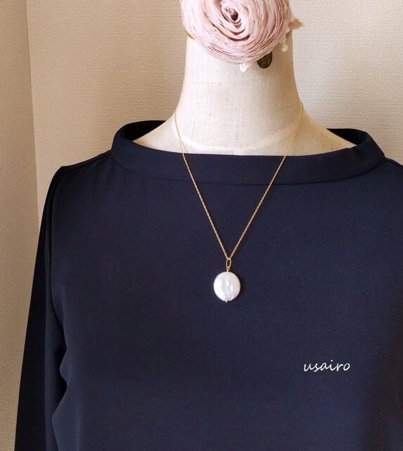 フラットなコイン型の淡水パールを使用したひと粒タイプのペンダントです。