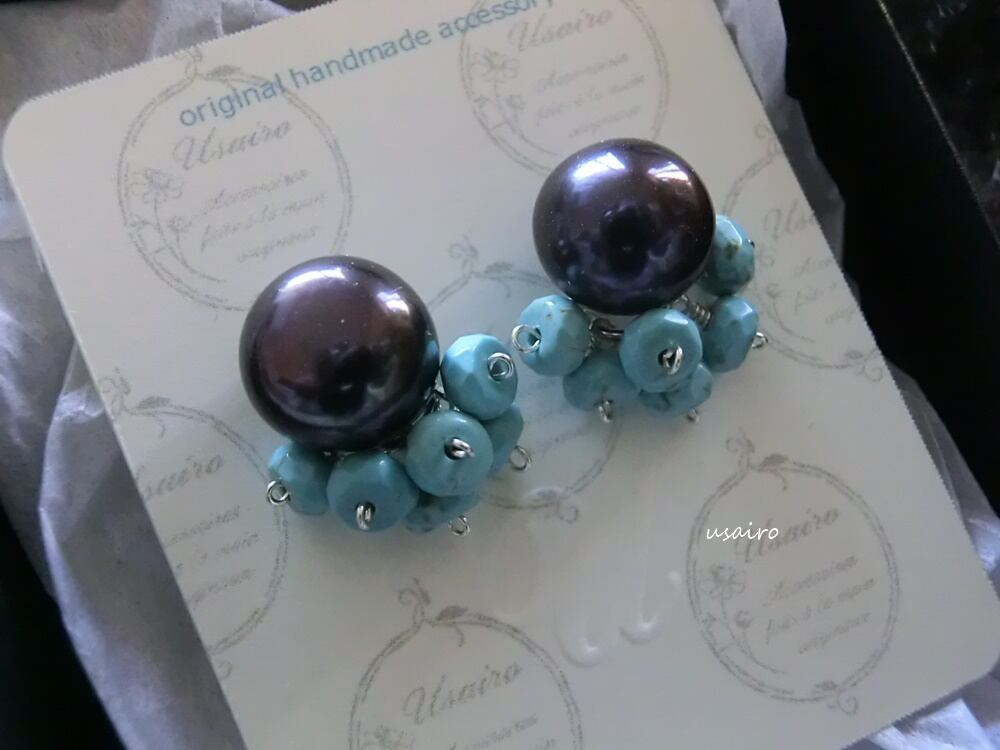 ぷっくり大粒のパールを使用したひと粒ピアスにマグネサイトターコイズが揺れるチャームをセット。