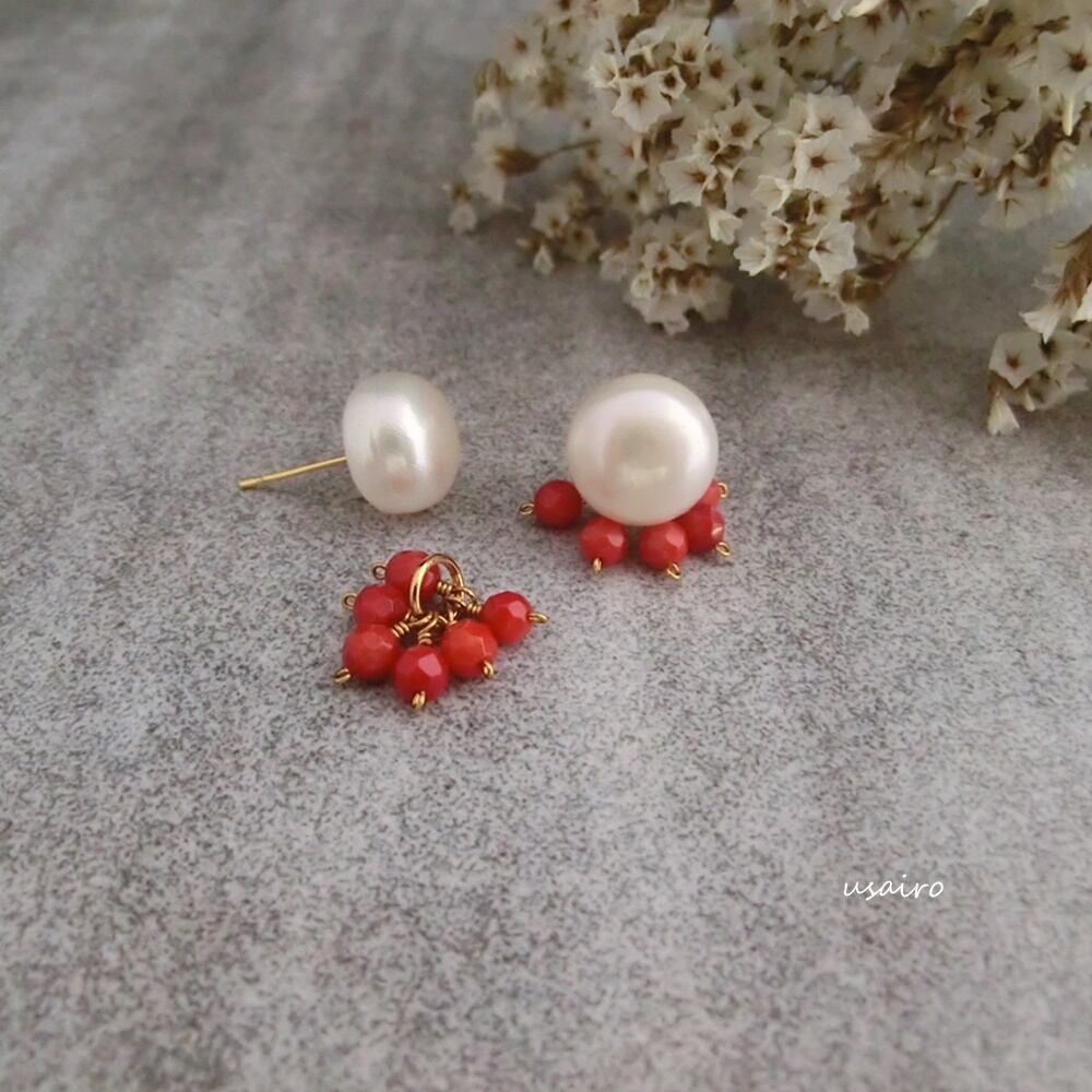ぷっくり大粒のパールを使用したひと粒ピアスにレッドコーラルが揺れるチャームをセット。