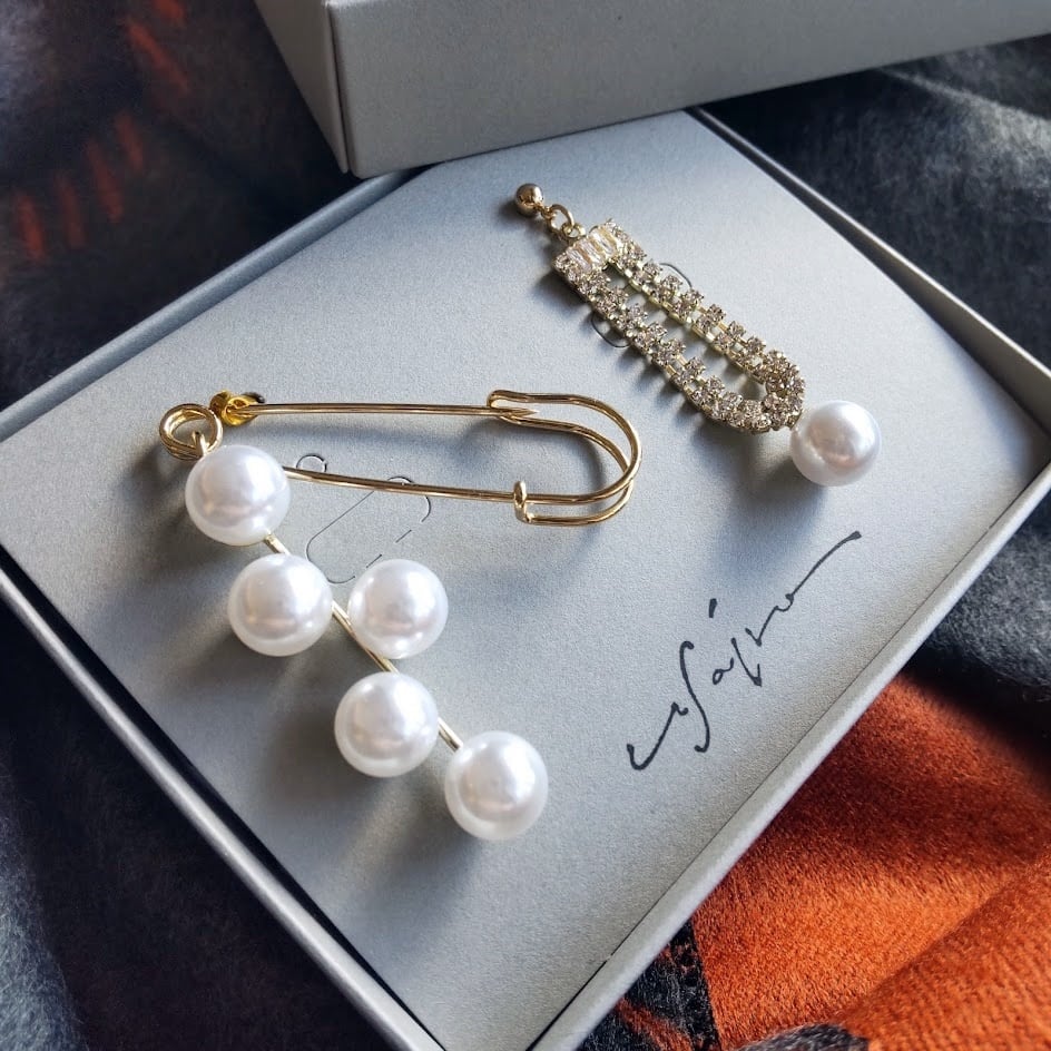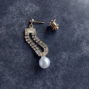 キラキラのビジュー、ラインストーンに一粒のパール調のチャームはタイタックピン仕様です。とてもしなやかで華やかなデザインです。