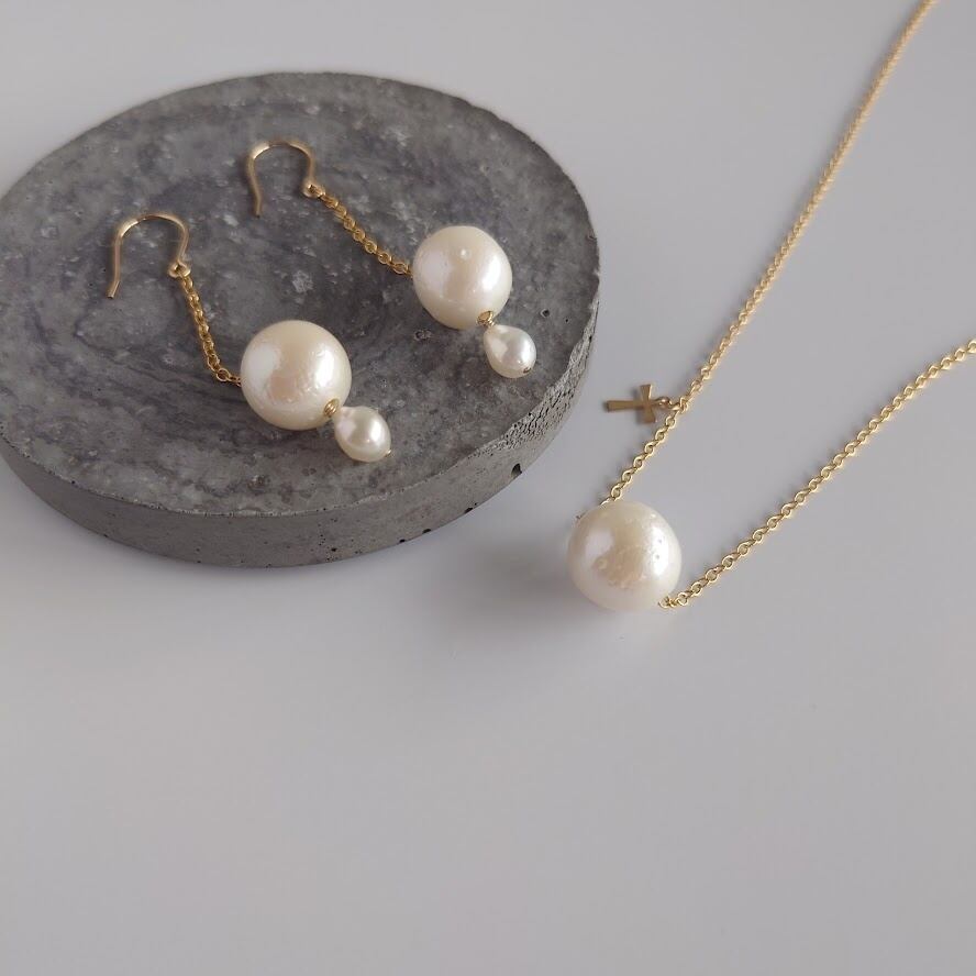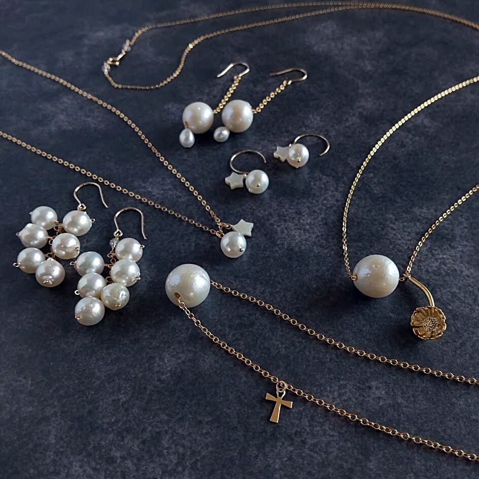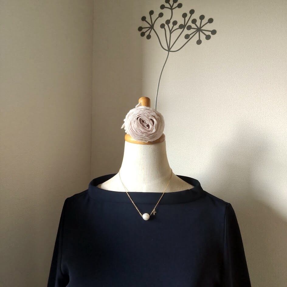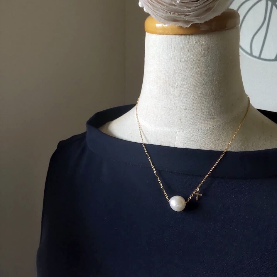 淡水パールのネックレスには小さなクロスチャームがサイドに付いていてさり気なく揺れるデザインに仕上げました。