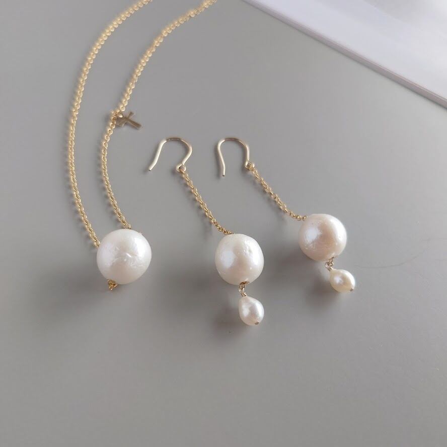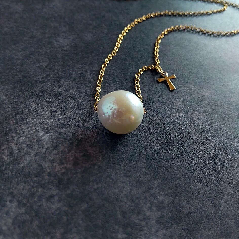 大きな淡水パールをチェーンに通したシンプルなデザインに小さなクロスチャームがアクセントのネックレス。