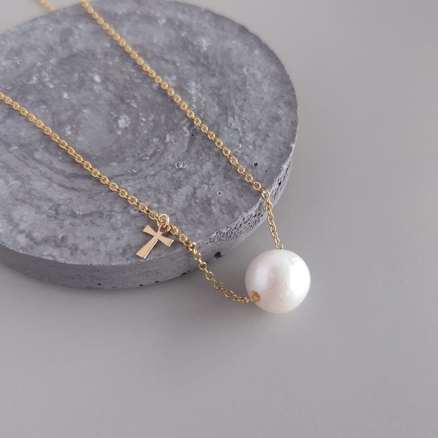 14kgfネックレス/大粒淡水パールとクロスチャームネックレス