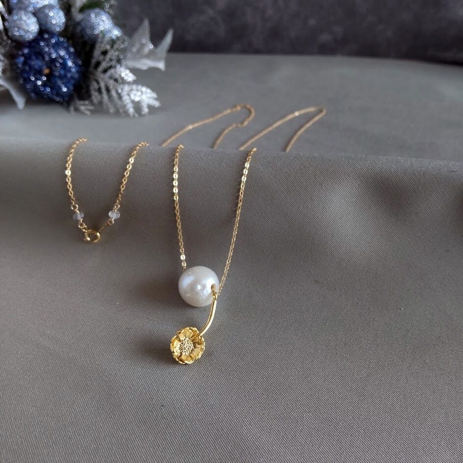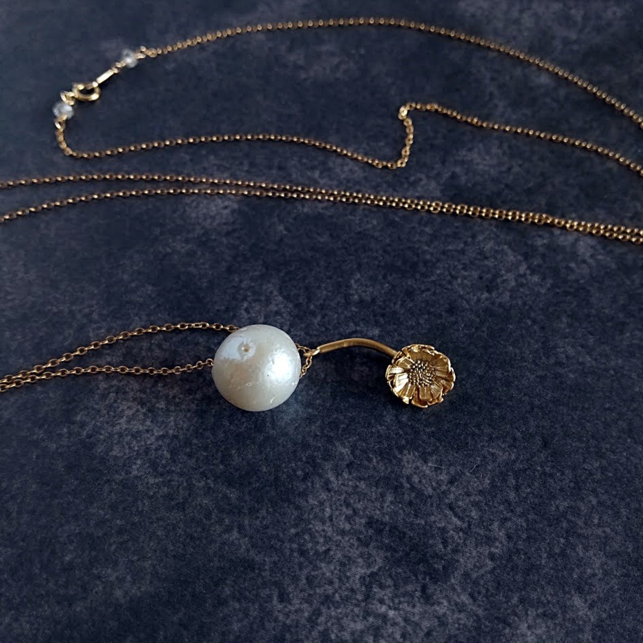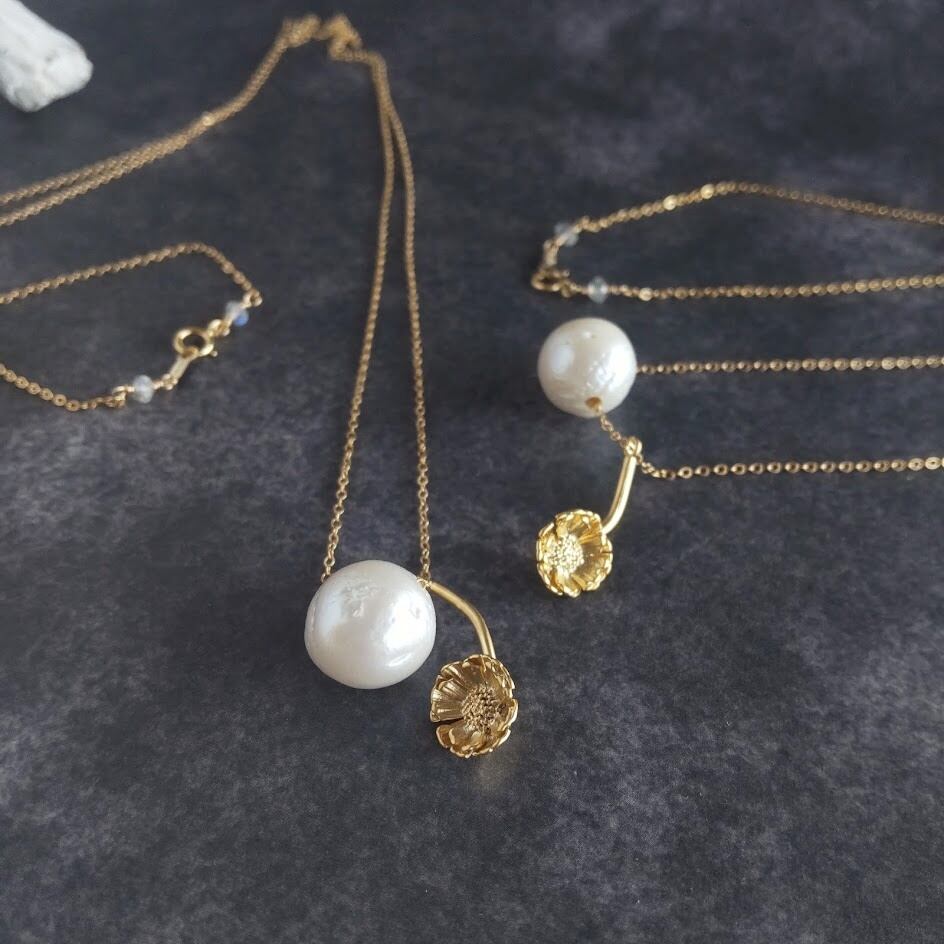 淡水パールと合わせて通したフラワーチャームがそっと寄り添うデザイン。