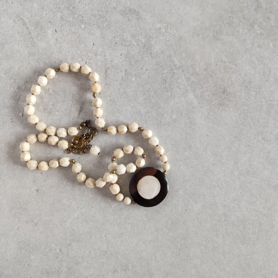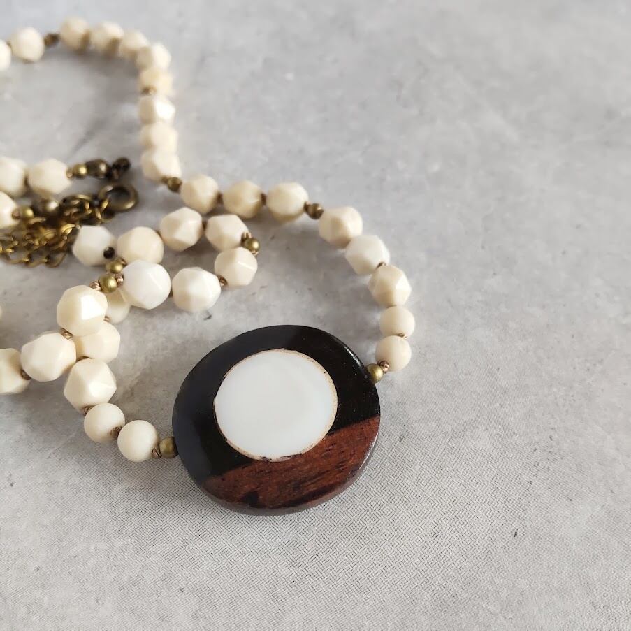 ウッド&シェルコインがアクセントのナチュラルシルクコードネックレス