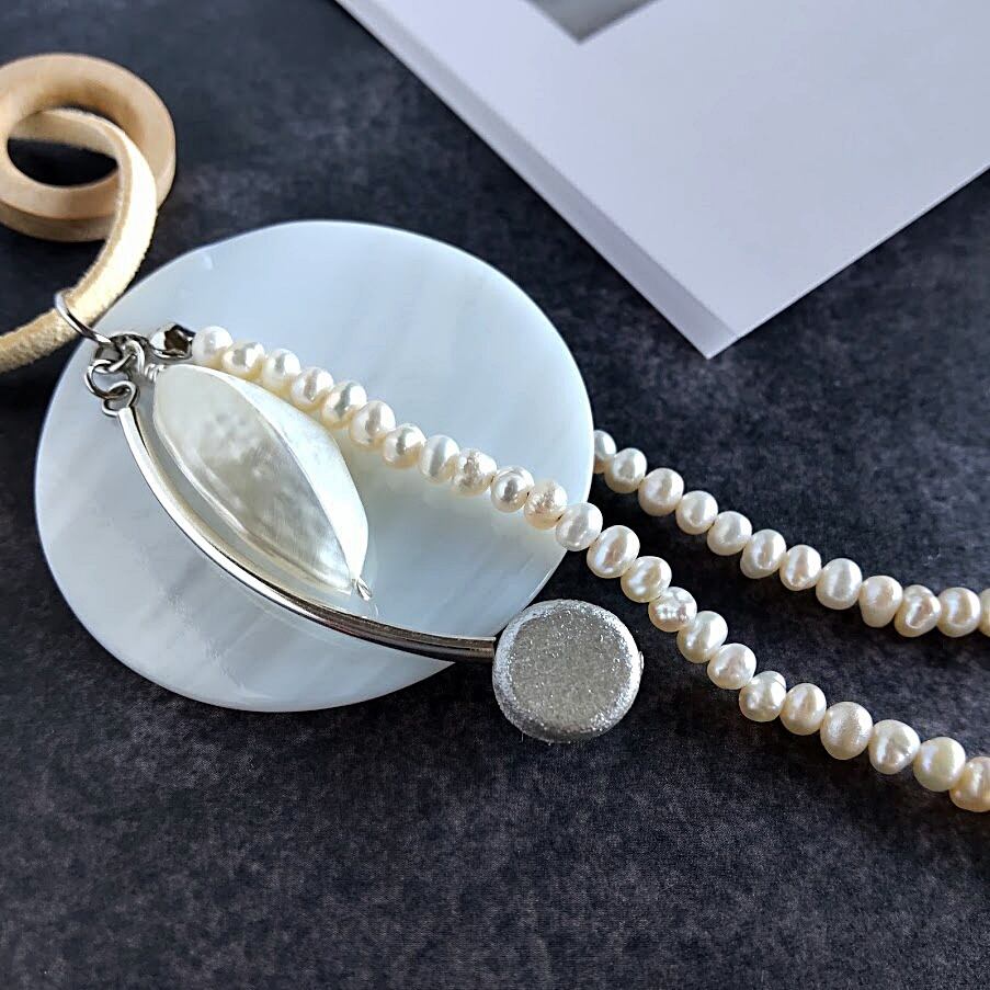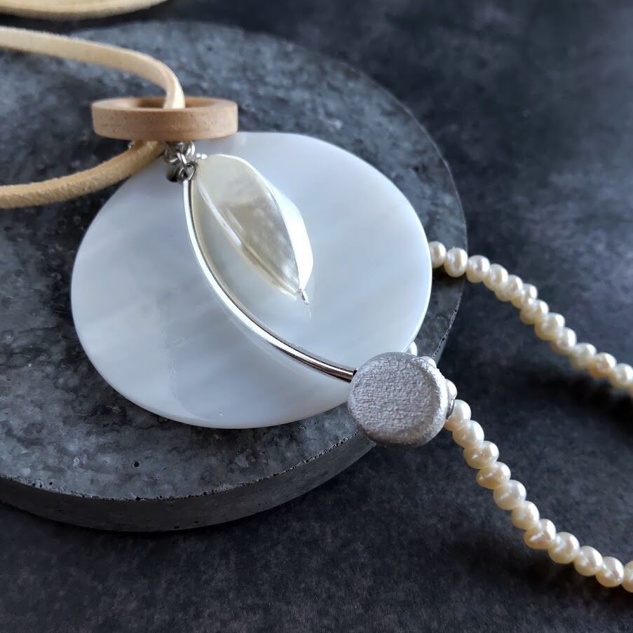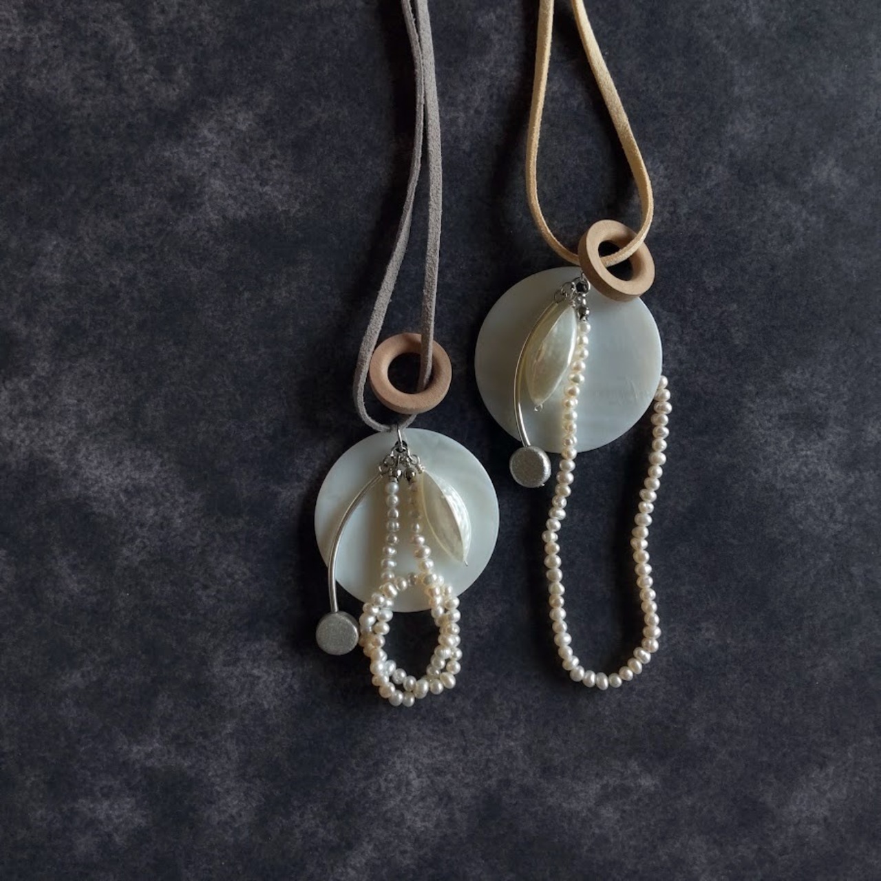 大ぶりシェルプレートとパールのカジュアルペンダント/Aロープ※おまけ:ブラックコード付