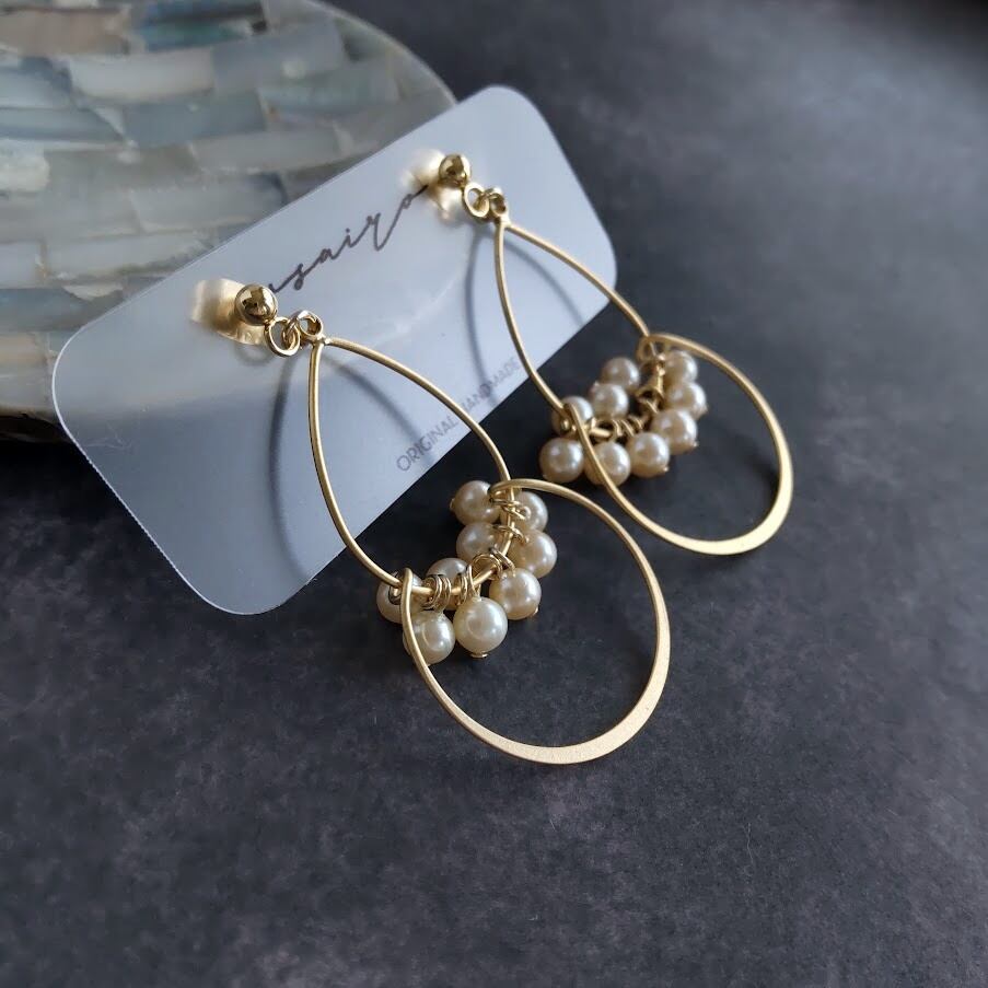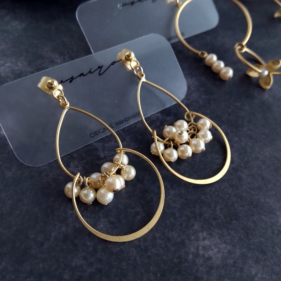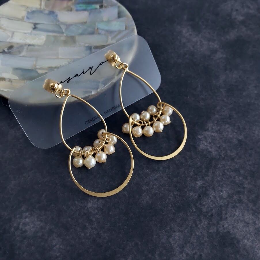 クリームカラーヴィンテージビーズしゃららんWフープピアス