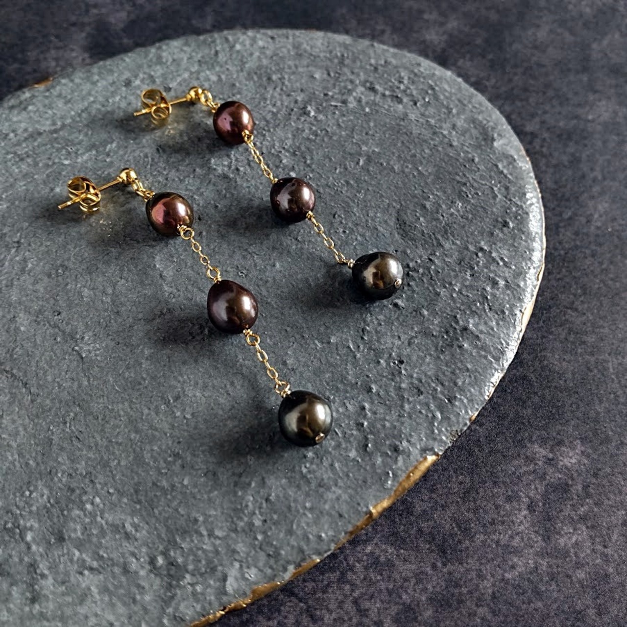 こっくりチョコレートカラーあり、やや赤みやグリーンもチラ見えするパールです。