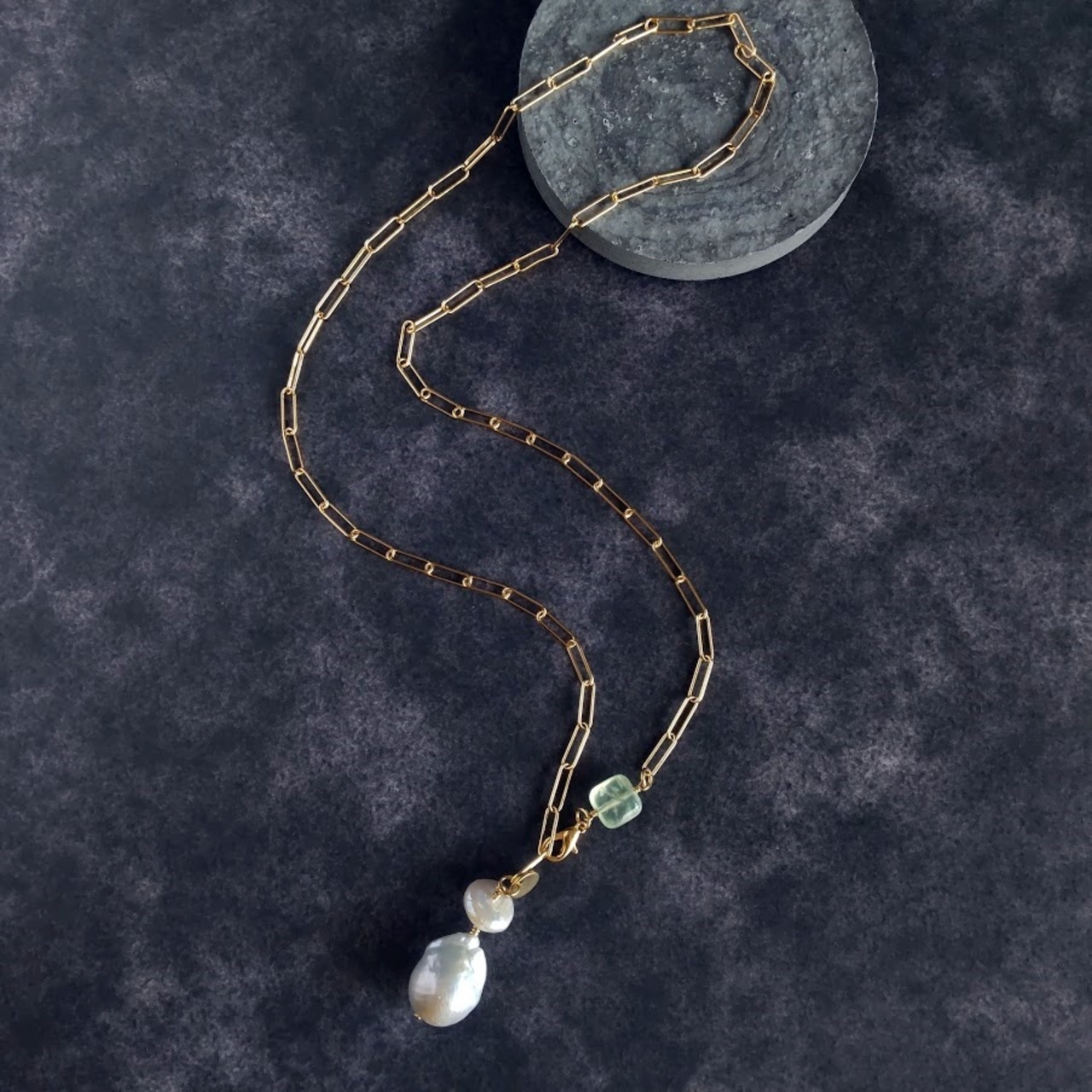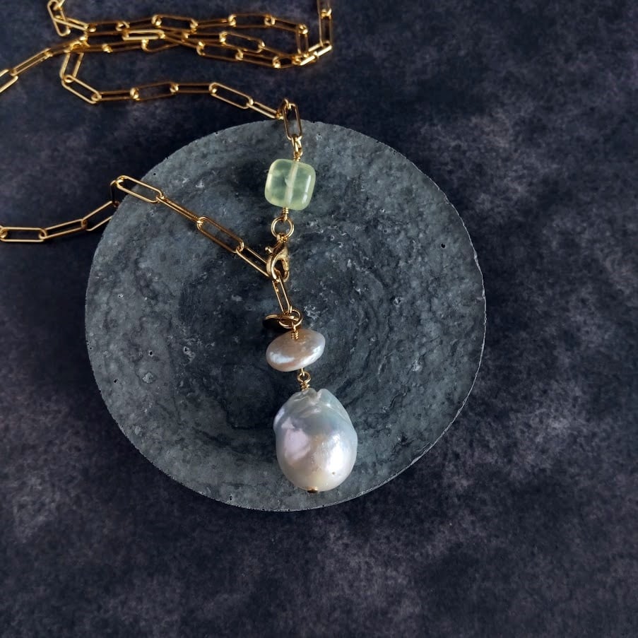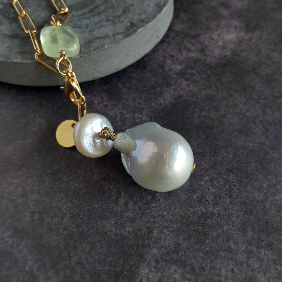 約20mmサイズの大粒バロックパールと平たい淡水パール、そしてスクエアのプレナイトを使用しています。