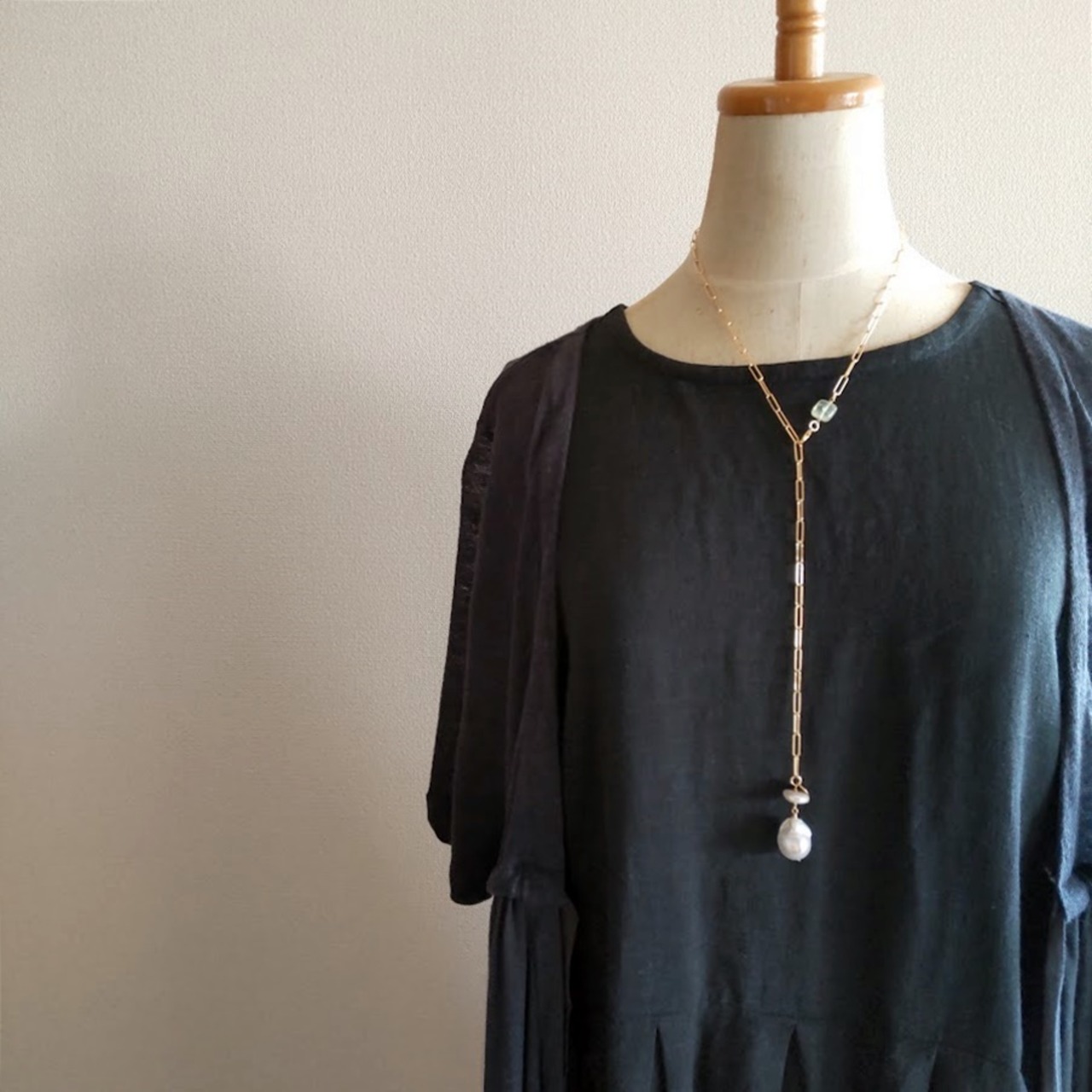 留め金具をチェーンのコマのお好きな位置に留めてお使いいただくデザインのネックレスです。