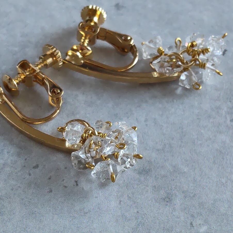 天然素材のダブルポイントクォーツ(両剣水晶)の透明度は、美しく、華やかにそして上品にキラキラと耳元を飾ってくれるデザインイヤリングに仕上がりました。