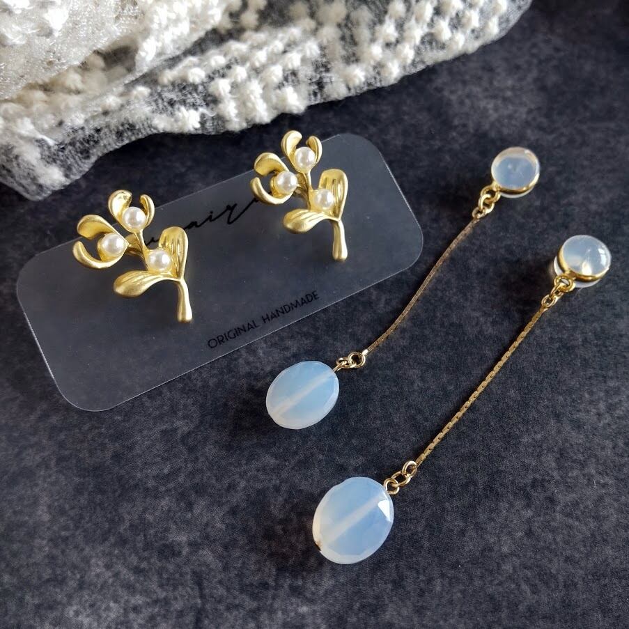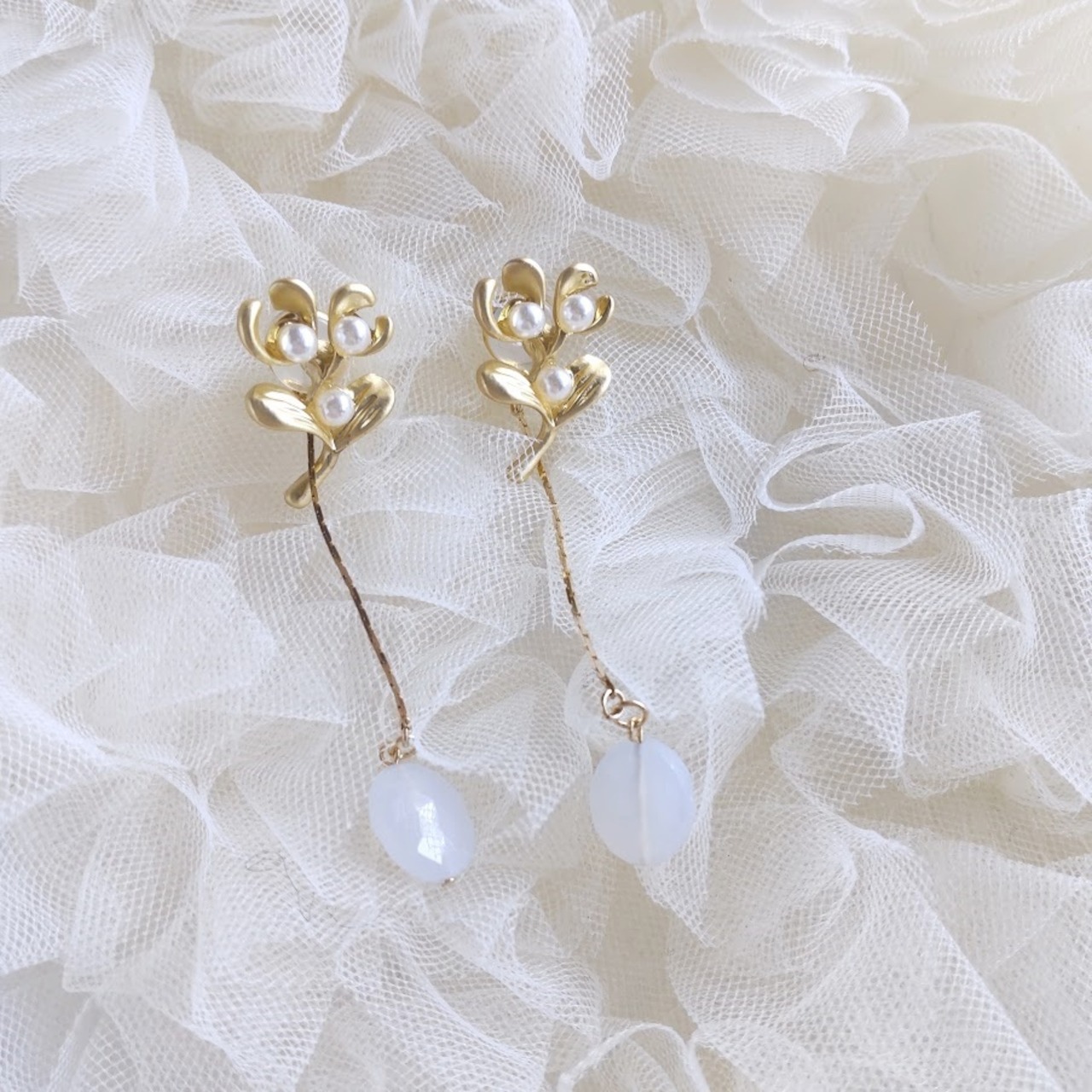 ナチュラルブルーカルセドニー2wayピアス/パール付き小枝