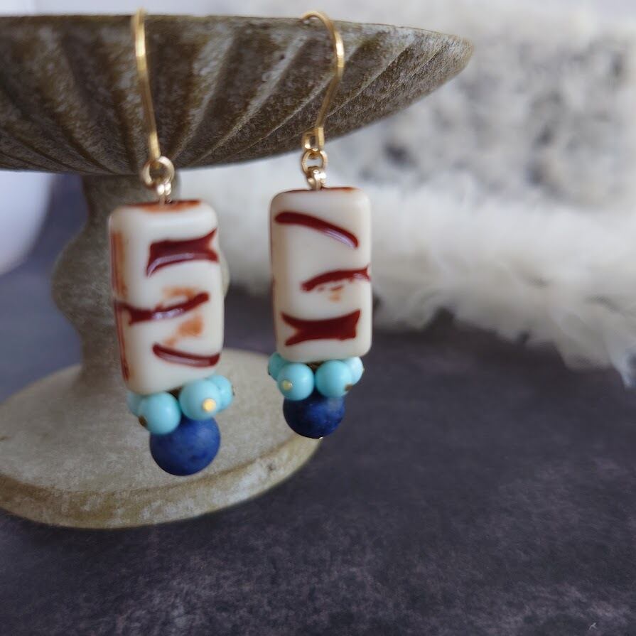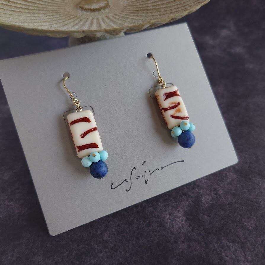 少し面白い柄の入ったスクエア型のヴィンテージビーズとブルー系の天然石を使ってピアスを作りました。