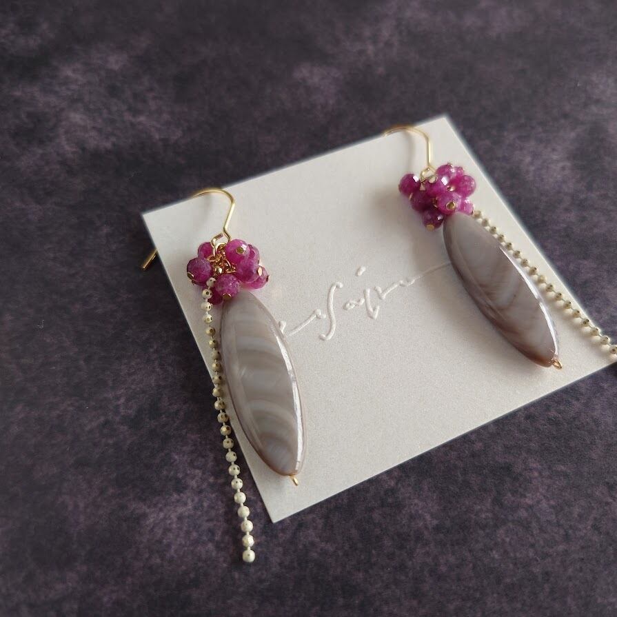 グレーカラーマーキス型シェル×ルビー エレガントピアス
