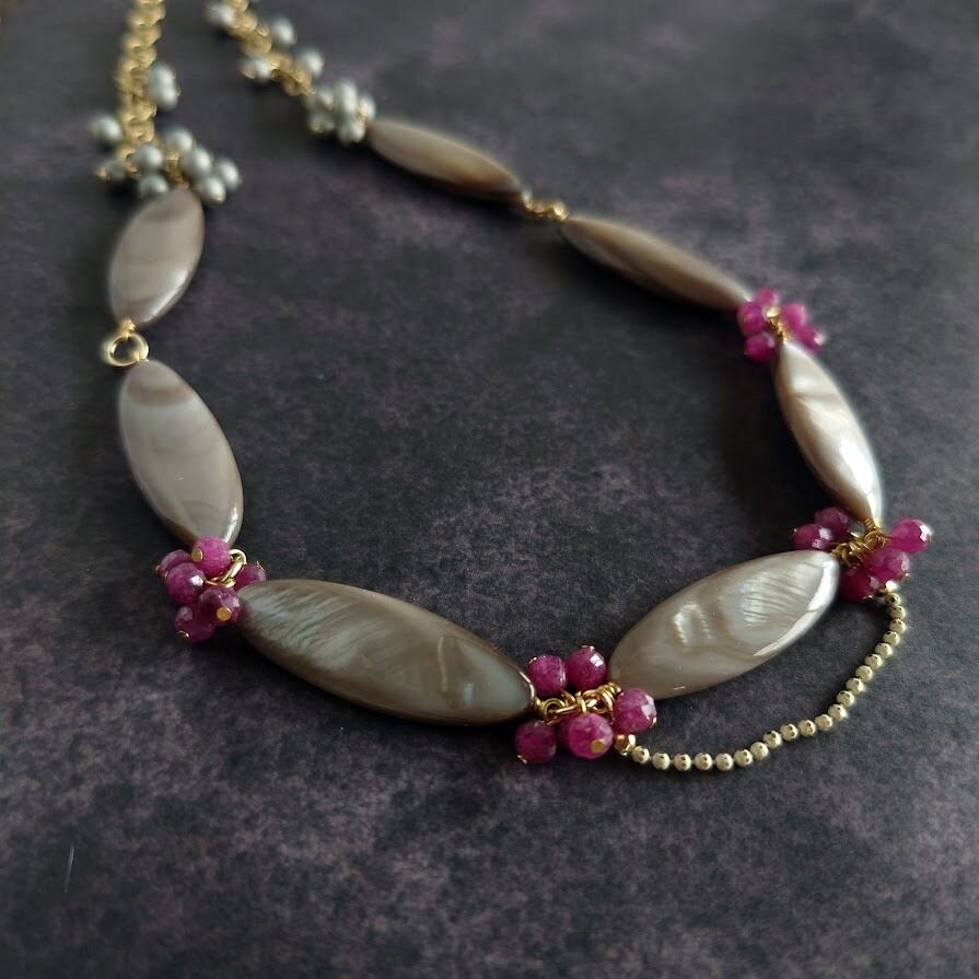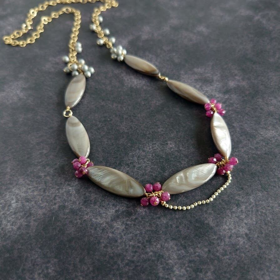 細長い縦長ラインが特徴的なマーキス型のシェルをメインにルビーでアクセントつけたデザインネックレスです。