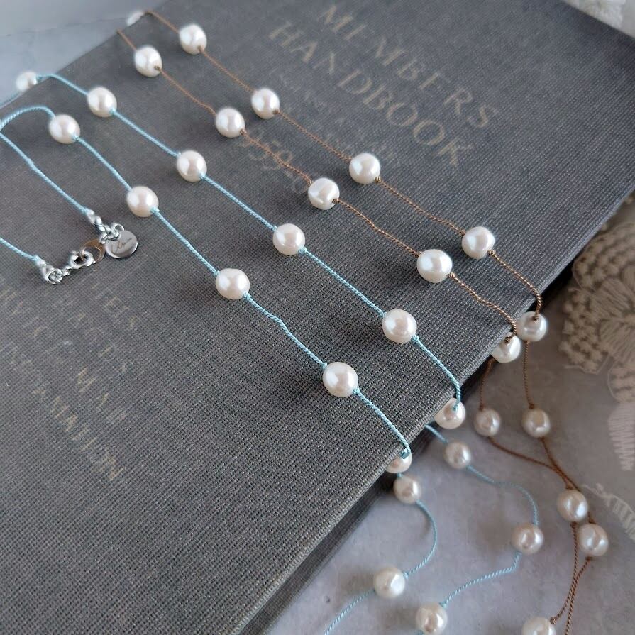 その貴重なヴィンテージパールビーズを使用してシルク糸に結び留めしていきました。