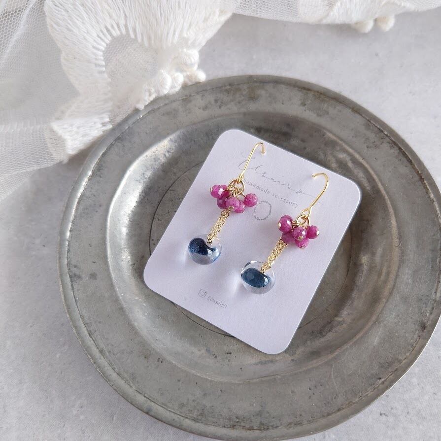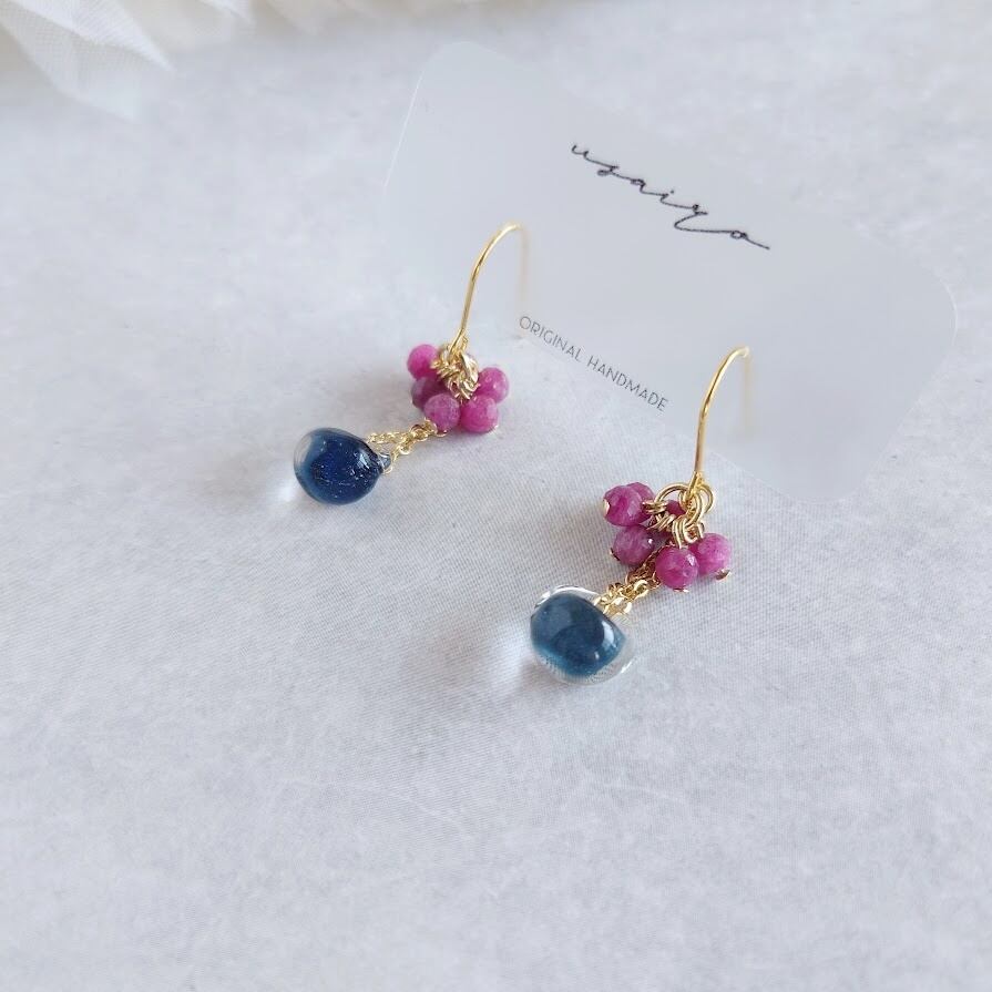 ティアドロップガラスビーズ /クリアネイビー×ルビー