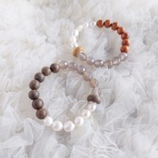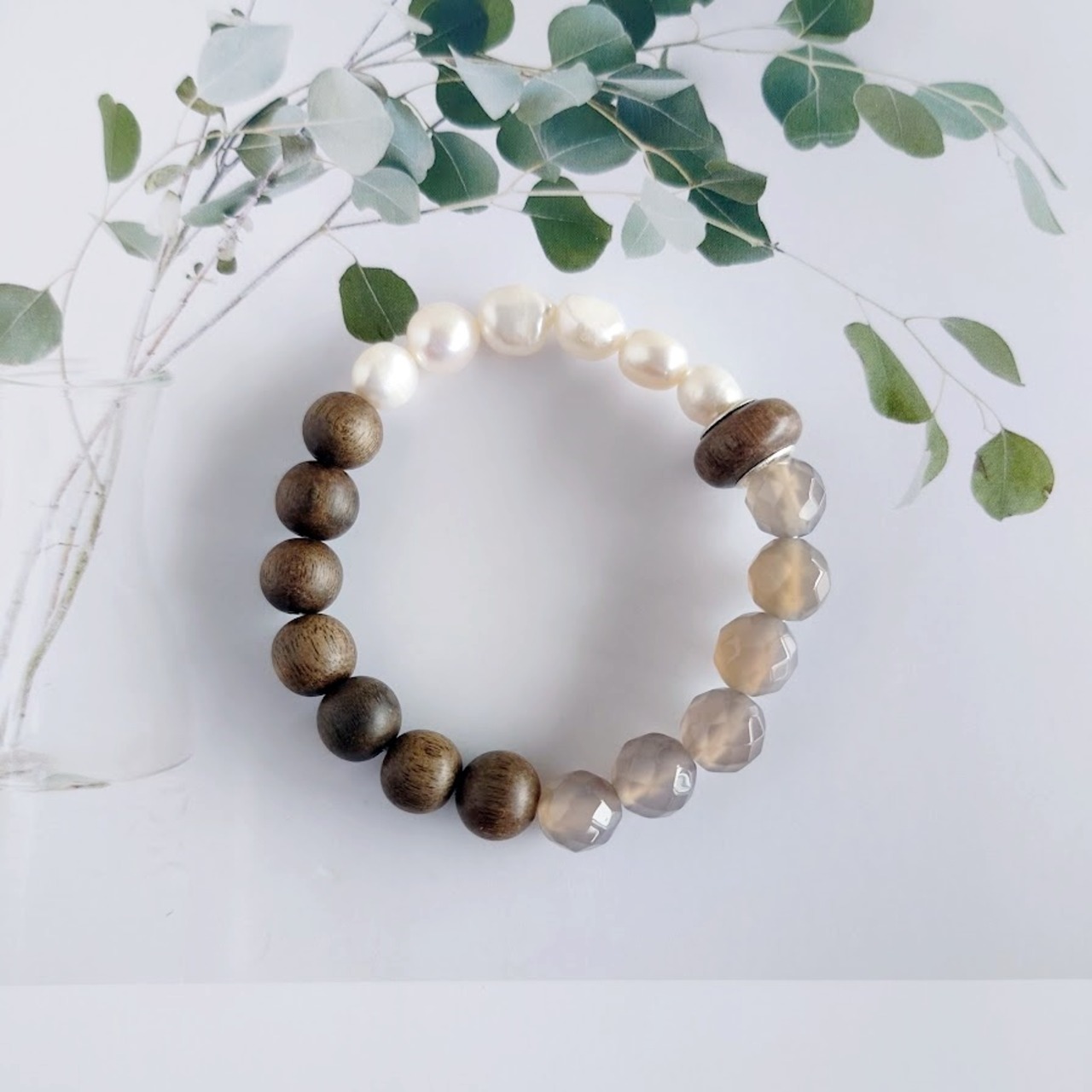 淡水パールバロック、グレーオニキス、そしてウッドビーズを集めてストレッチブレスレットをお作りしました