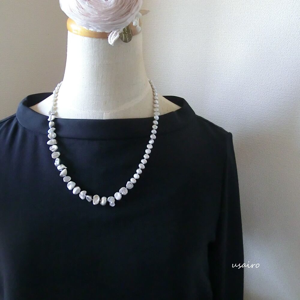 大人の女性らしさを引き立てるライトシルバーカラーの淡水パールを2種類使っています。